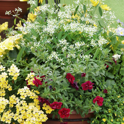 Piękną rośliną nadającą się do wypełniania kompozycji roślin balkonowych jest także bakopa (Sutera diffusa), posiadająca liczne, dość duże, białe kwiaty (u odmian różowe lub czerwone).