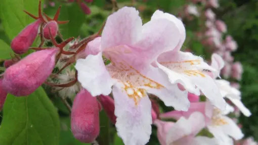 Kolkwicja chińska (Kolkwitzia amabilis) ‘Pink Cloud’ została uzyskana w Anglii w latach 40. XX wieku. To krzew, który dorasta do 2-3 m wysokości i osiąga podobną szerokość. Gałęzie pokrywa szarobrązowa kora łuszcząca się atrakcyjnie długimi płatami. Liście są eliptyczne, o gładkich brzegach, zielone, owłosione, mają od 3 do 7 cm długości. Jesienią przebarwiają się na purpurowo.