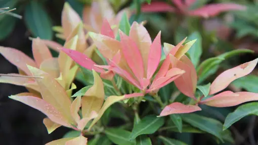Młode, rozwijające się wiosną liście są karminowe i różowe, potem ceglaste, z odcieniami różu i miedzi. W pełni dojrzałe blaszki liściowe są lancetowate, skórzaste, soczyście zielone i błyszczące, na brzegach z charakterystyczną, ozdobną, białą obwódką.