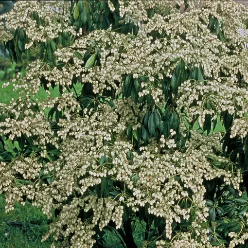 Pąki kwiatowe zawiązują się pod koniec lata na wierzchołkach pędów, rozwijają się w kwietniu. Białokremowe, dzwoneczkowate kwiaty są zebrane w zwisające, wiechowate kwiatostany, chętnie odwiedzane przez pszczoły i trzmiele. Kwitnienie nie jest tak spektakularne, jak innych odmian pierisów, jednak kolorowe, młode liście sprawiają, że nie da się przejść obojętnie obok tych roślin.