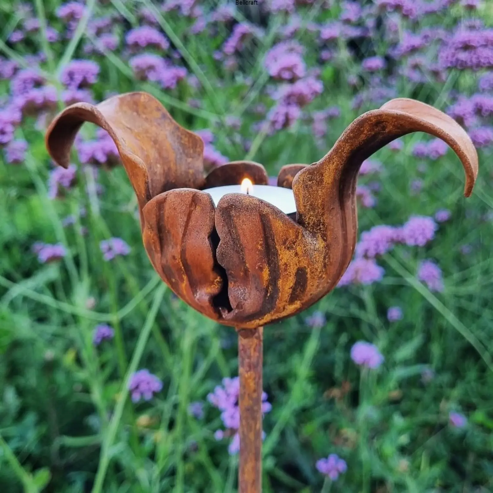 Dekoracyjny świecznik ogrodowy pokryty naturalną rdzą na małe podgrzewacze tealight. Świecznik wykonany jest na bazie metalowego ozdobnego kielicha, w którym wspawana jest owalna wkładka do włożenia świeczki. Na spodzie znajduje się mały otwór ułatwiający odpływ wody opadowej. Lampion osadzony jest na średniej wysokości pręcie (ok. 105 cm), dzięki czemu sprawdzi się zarówno jako dekoracja w ogrodzie jak i w większej donicy na tarasie. Pomoże też stworzyć przytulny klimat podczas wieczornych przyjęć w ogrodzie.