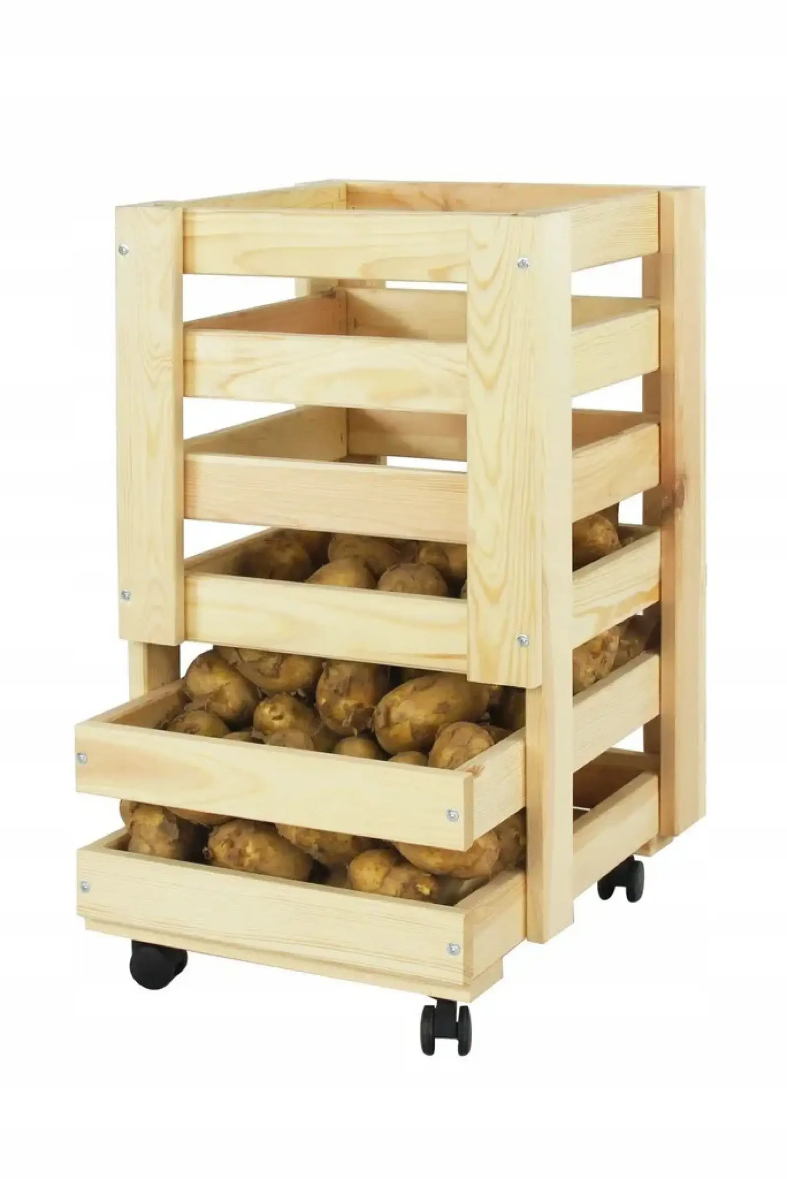 Skrzynia doskonale nadaje się do przechowywania ziemniaków, marchwi i innych produktów, co pozwala na ich dłuższą świeżość. Ażurowe boki zapewniają wentylację, co skutkuje wydłużeniem czasu przydatności przechowywanych warzyw. Podajnik umożliwia wygodne sięganie po warzywa, eliminując problem z ich wyjmowaniem.