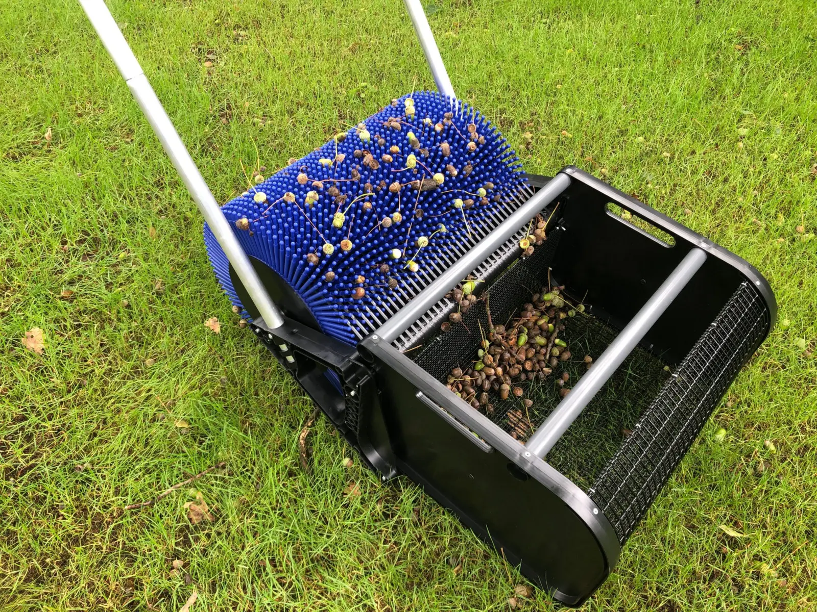 Zbieracze żołędzi i orzechów laskowych marki Bag-A-Nut sprawiają, że prace ogrodowe przebiegają szybciej i przyjemniej. Zbiór nie wymaga znaczącego wysiłku fizycznego – można go porównać do pchania kosiarki.