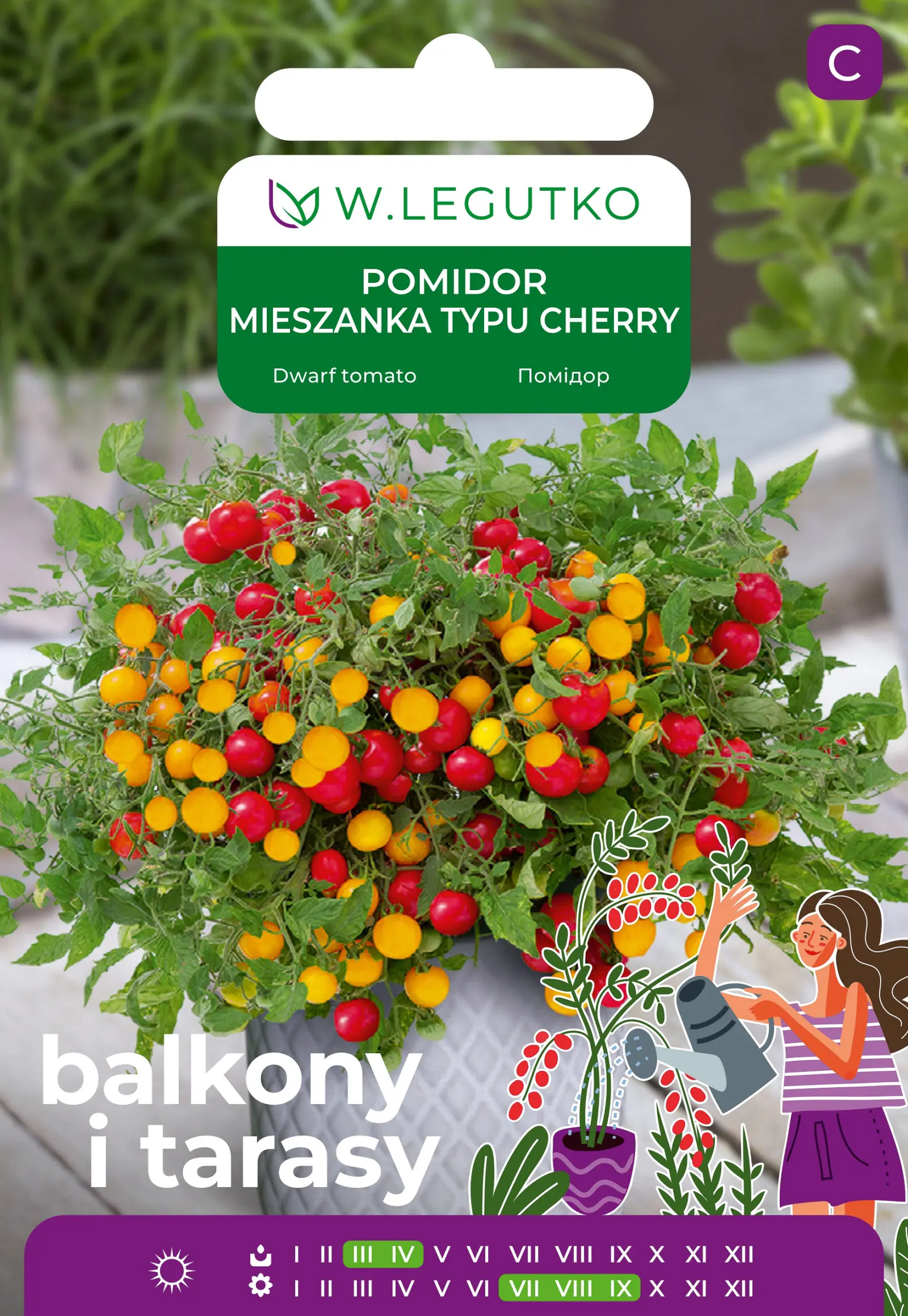 Mieszanka nasion karłowych odmian pomidora tworzących drobne, kuliste owoce barwy czerwonej i żółtej. Idealny do uprawy w donicach na balkonach i tarasach.