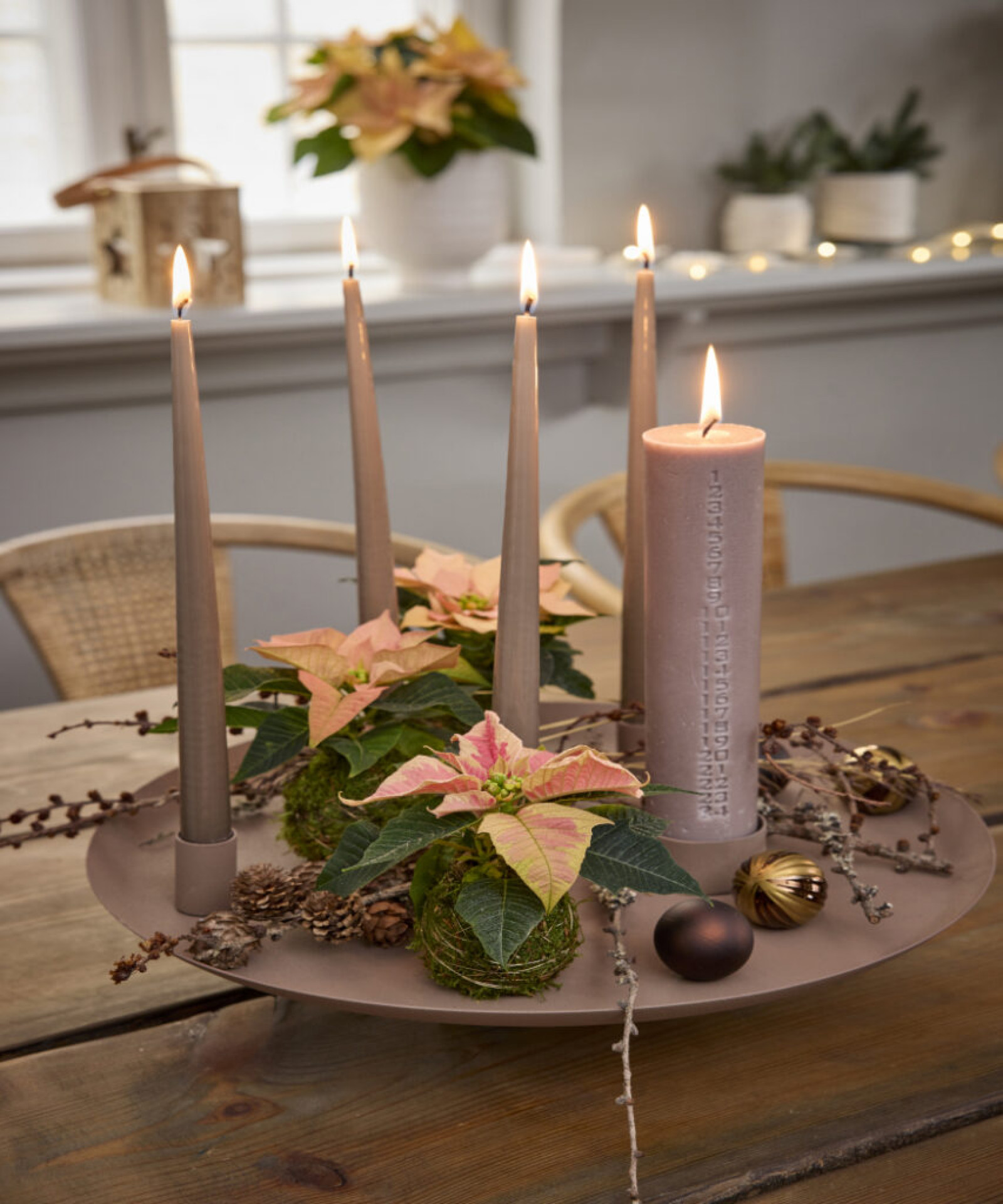 ▲ Na prostej, piaskowej tacy z magnetycznymi świecznikami, smukłe, stożkowe świece oraz okazała świeca kalendarzowa w dopasowanym odcieniu tworzą ciepłe punkty światła. Kokedamy z miniaturowymi poinsecjami w delikatnych odcieniach moreli, kremu i różu, a także naturalne gałązki, szyszki i subtelne bombki dopełniają tę stylową, skandynawską aranżację.