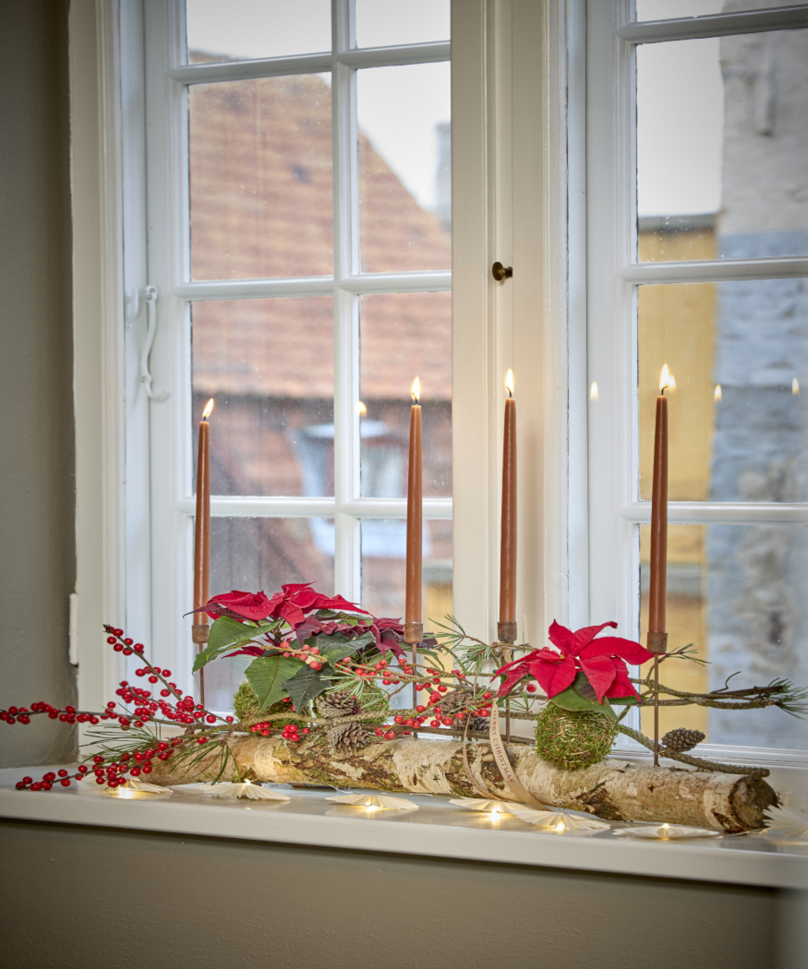▲ Dekoracja okienna wprowadza do wnętrza powiew natury i świąteczny nastrój. Jej podstawą jest brzozowy pień uzupełniony czterema smukłymi, karmelowymi, stożkowymi świecami. Kokedamy z intensywnie czerwonymi, miniaturowymi poinsecjami zdają się unosić nad tą zimową aranżacją. Gałązki ostrokrzewu, szyszki i delikatny łańcuch świateł tworzą harmonijną kompozycję, która wnosi życie i magię do wnętrza.