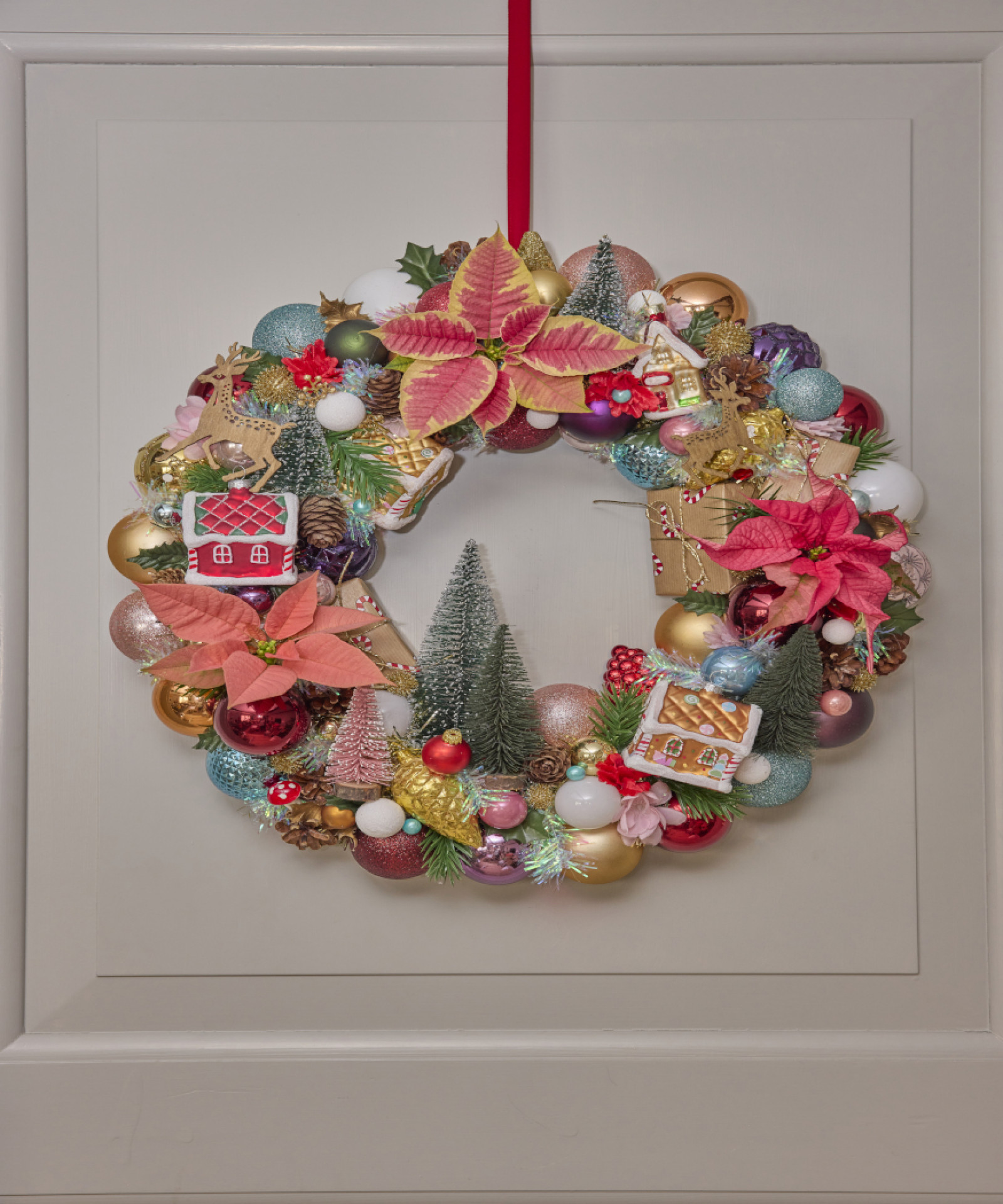 ▲ Kolorowy, połyskujący wieniec na drzwi wykonano na bazie słomianego stelaża i bogato ozdobiono barwnymi bombkami, miniaturowymi prezentami, choinkami i innymi świątecznymi dodatkami. Szczególną uwagę zwracają trzy bombki wypełnione wodą i ciętymi poinsecjami – żywy, kwiatowy akcent, który przyciąga wzrok. Metaliczne błyski i matowe wykończenia łączą się tu w stylową dekorację w stylu retro.