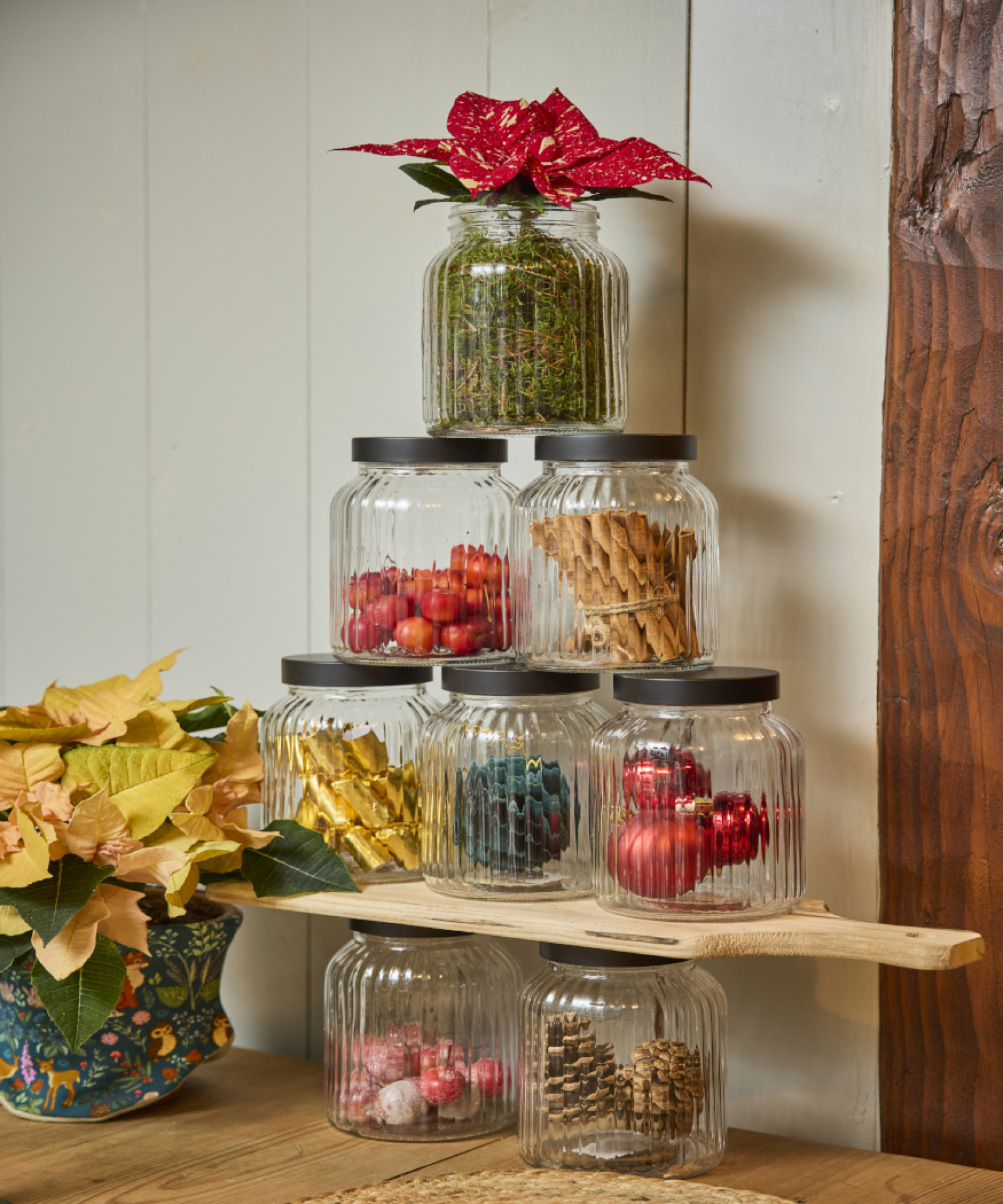 ▲ Ustawione jeden na drugim szklane słoje, wypełnione naturalnymi i świątecznymi ozdobami, tworzą pomysłową choinkę – alternatywę dla tradycyjnego, świątecznego drzewka. Laski cynamonu, jabłka, szyszki, bombki i cukierki w złotych papierkach tworzą spójną, świąteczną kompozycję. Całość wieńczy czerwono-biała, nakrapiana poinsecja, która rozświetla wypełniony mchem słoik. Jest to urokliwy pomysł i nietuzinkowa dekoracja w stylu skandynawskim.