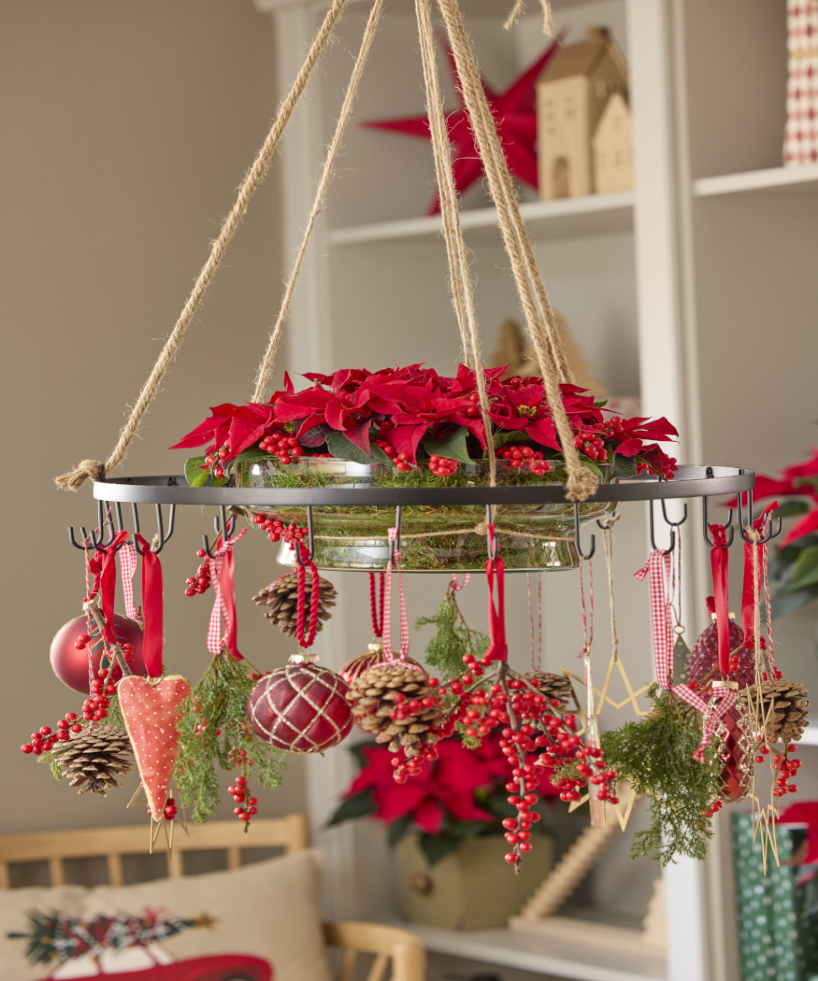 ▼ Ta nietypowa dekoracja adwentowa została oparta na wiszącym metalowym pierścieniu zawieszonym na linie. Centralnym elementem kompozycji jest szklana misa wypełniona intensywnie czerwonymi miniaturowymi poinsecjami. Wokół niej zawieszono klasyczne świąteczne ozdoby, szyszki, jałowiec, gałązki ostrokrzewu i sosny, które nadają wieńcowi naturalny charakter.