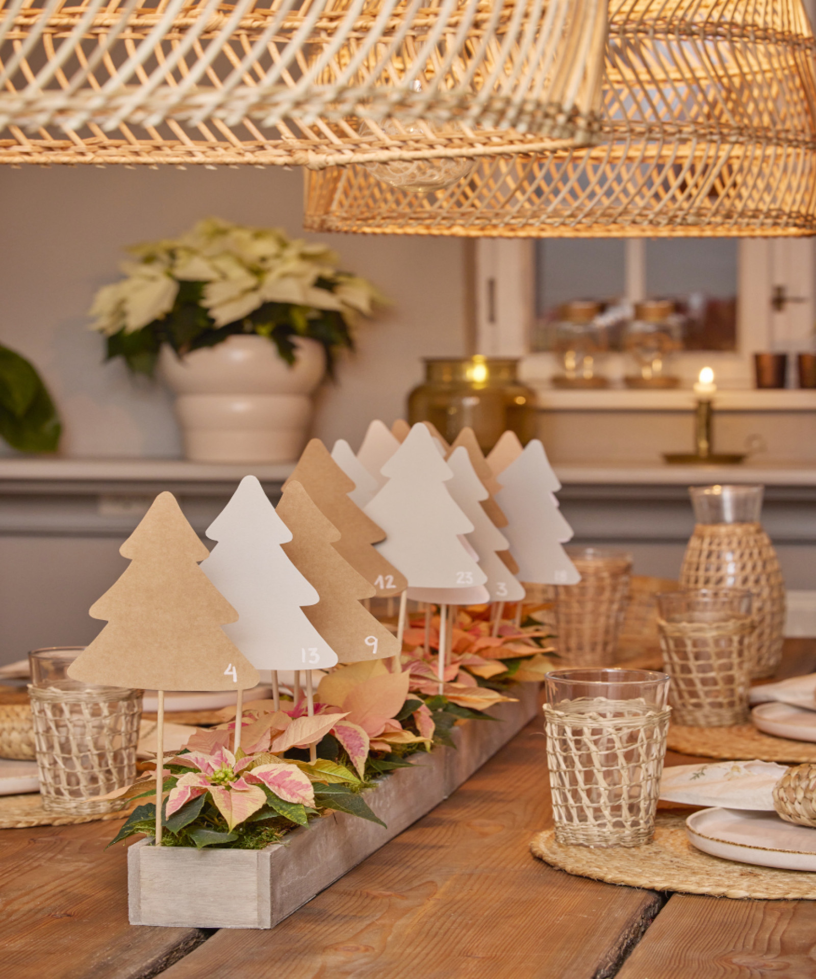 ▼ Miniaturowe poinsecje w delikatnych odcieniach różu, kremu i moreli tworzą bazę tego kalendarza adwentowego w stylu skandynawskim. Dwadzieścia cztery ponumerowane drzewka w kolorach bieli, srebrzystoszarości i beżu ustawione na cienkich, drewnianych patyczkach tworzą zimowy, leśny pejzaż. Za każdym drzewkiem znajduje się zrolowana kartka z osobistym, świątecznym przesłaniem.