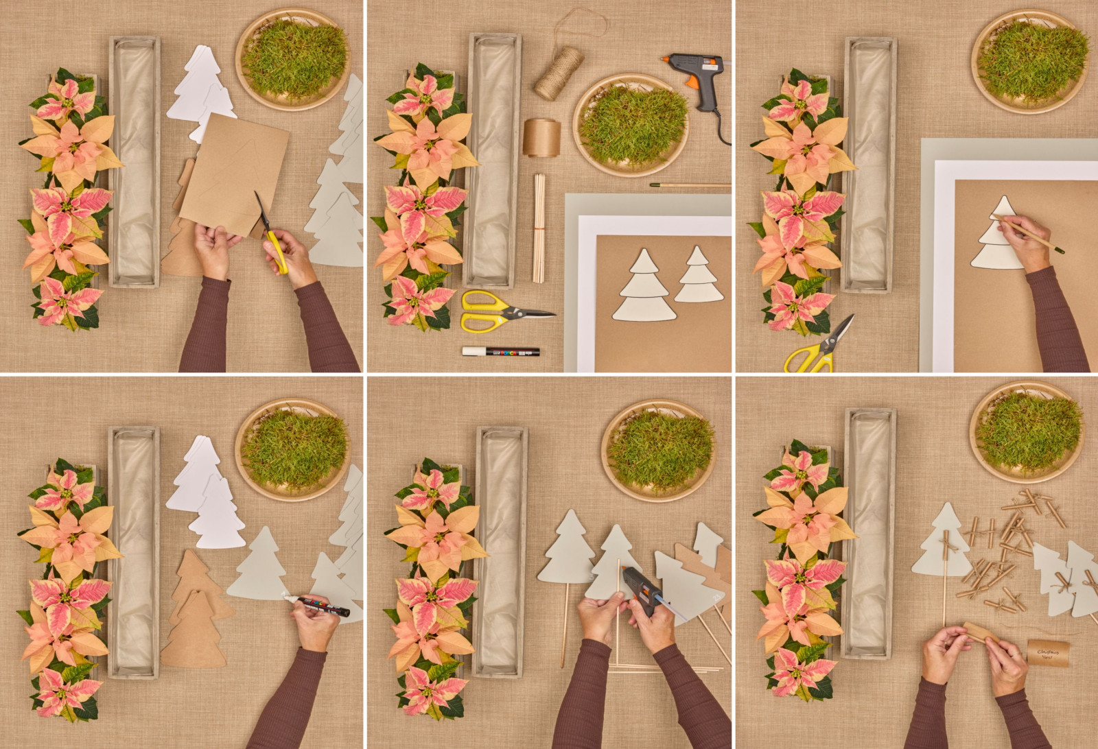 - Dopełnij kompozycję, umieszczając patyczki z choinkami w skrzynkach z poinsecjami i mchem. Ustaw je na różnych wysokościach, tworząc trójwymiarową, zimową leśną scenerię.