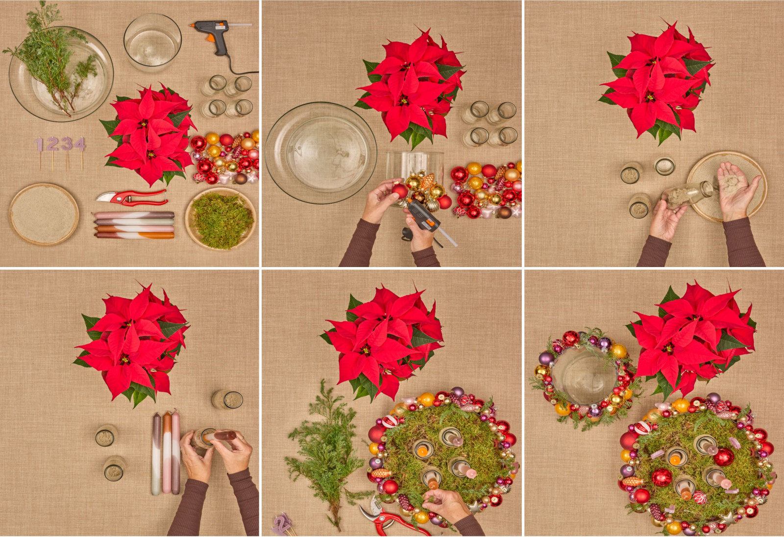Do wykonania tego projektu potrzebne są następujące materiały: czerwona doniczkowa poinsecja, płytka szklana misa, cylindryczny szklany wazon, cztery świece ombre lub w ciepłych kolorach, cztery małe butelki ze szklanym szerokim otworem do umieszczenia świec, kolorowe bombki (matowe i błyszczące) w różnych rozmiarach oraz ozdoby, takie jak szyszki, gałązki jałowca, takie jak szyszki, gałązki jałowca, suchy mech, piasek, pistolet do kleju na gorąco z wkładami, sekator oraz cztery świeczki na patyczkach z numerami od 1 do 4.