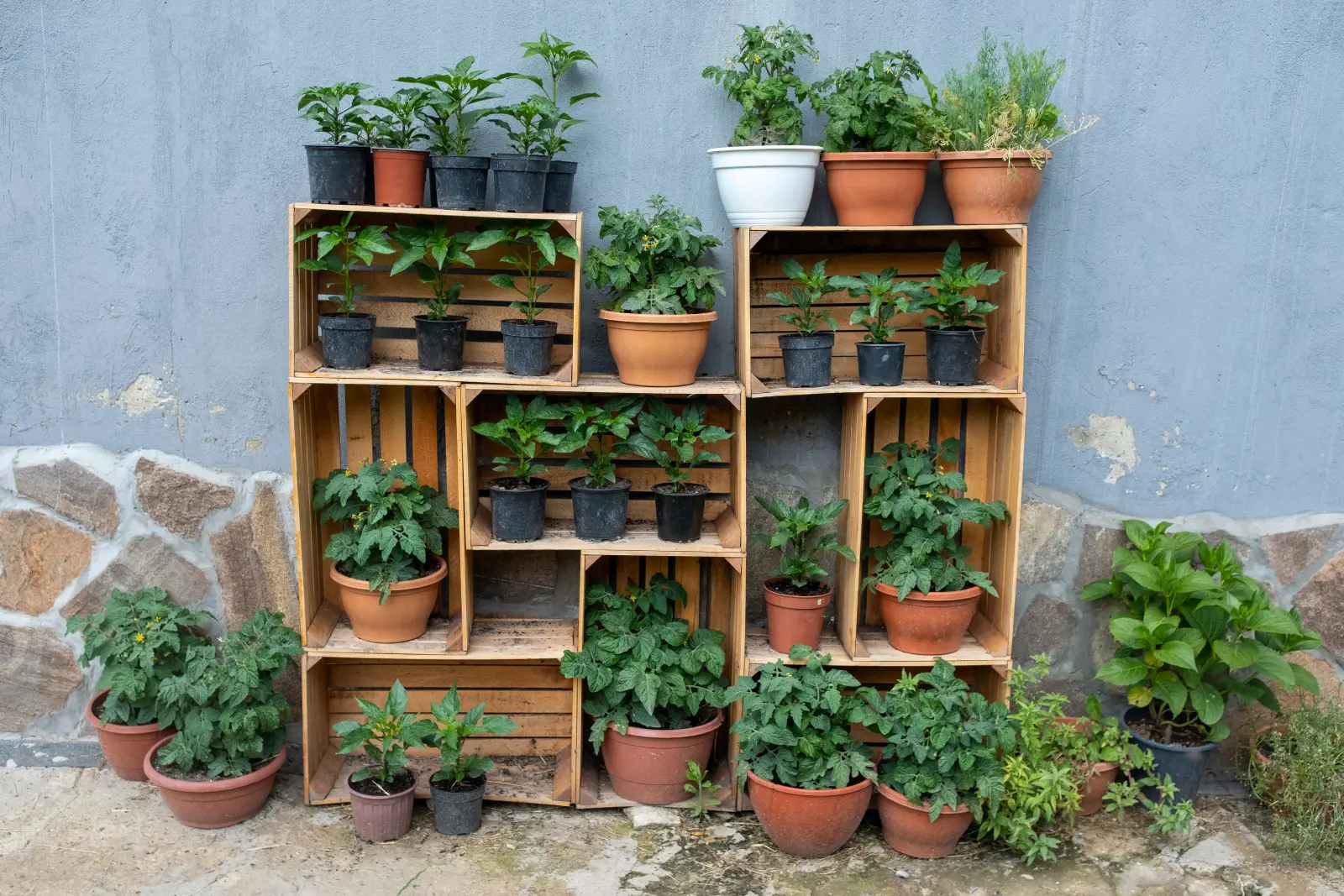 Ustaw skrzynki jak regał – poziomo i pionowo, na zakładkę. To dobry kadr do zdjęć z pomidorami, papryką, bazylią czy rozmarynem. Kątowniki przykręcone do ściany ustabilizują całość; na ziemi podłóż płytki lub deski, by drewno nie ciągnęło wilgoci. W wyższych "półkach" postaw donice z roślinami silniej rosnącymi, a w płytszych – zioła i sałaty. Taka konstrukcja maksymalnie wykorzystuje wysokość, a pielęgnacja jest wygodna, bo wszystko jest pod ręką.