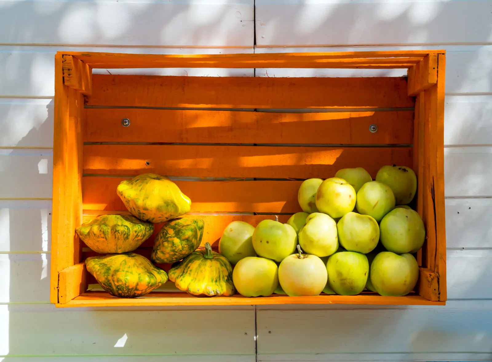 Jedną skrzynkę można zamienić w wiszącą półkę. Wystarczą dwa kołki rozporowe i wkręty przez tylną ściankę. Dla efektu pomaluj skrzynkę na intensywny kolor – kontrast z białą ścianą podkreśli plony. Zostaw margines wentylacyjny między ścianą a owocami, aby nie gromadziła się wilgoć.