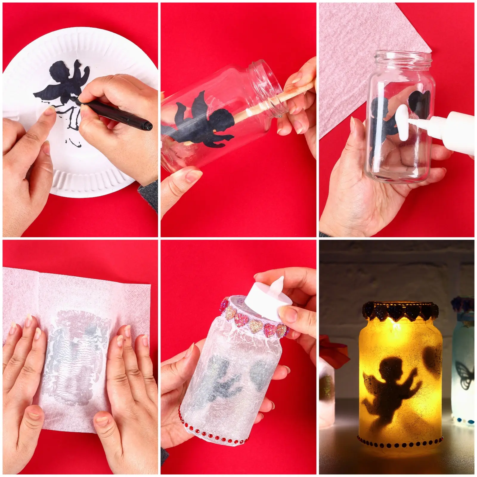 - Włóż aniołka lub inną przygotowaną dekorację do suchego, czystego słoika i umieść przy samej ściance. Możesz przykleić dekorację od środka do ścianki przeźroczystym klejem, aby się nie przesuwała i by nie było widać śladu kleju. Pozostaw klej do wyschnięcia.