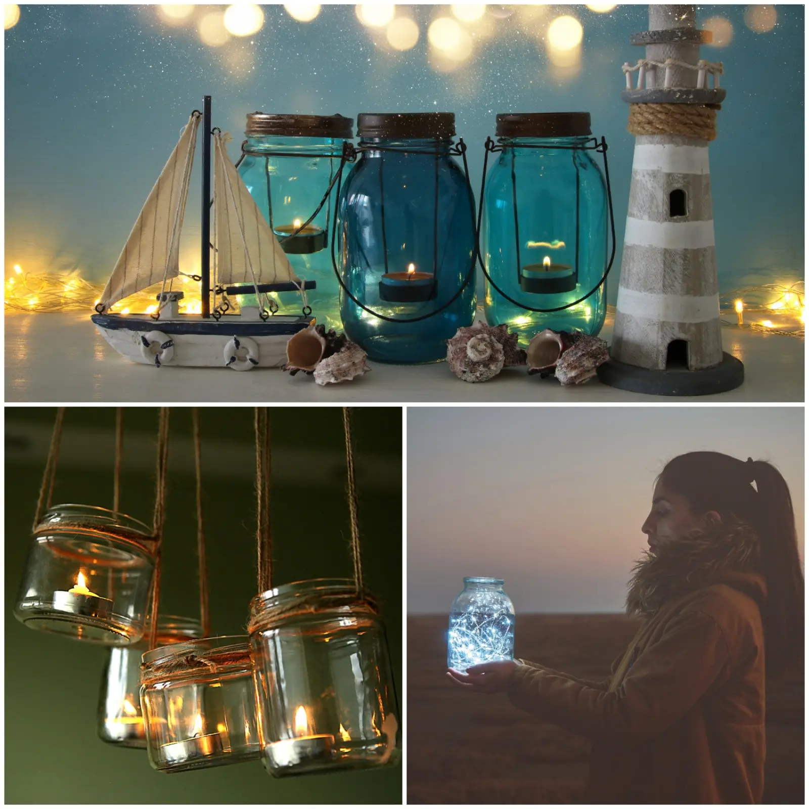 Jeden z prostszych sposobów na zrobienie lampionu do ogrodu lub na taras jest włożenie do słoika sznura lampek micro LED, zwanego też drucikami (na baterię lub z łączem USB). Takie sznury lampek można łatwo zwinąć i włożyć do środka do słoików i zamknąć (do wykorzystania na zewnątrz należy wybrać lampki wodoodporne). Jeśli nie chcemy wkładać do lampiony tradycyjnej świeczki lub tealightów, wybierzmy lampki, na baterię lub USB (dostępne obecnie w wielu rodzajach, emitujące zarówno ciepłe, jak i zimne światło.