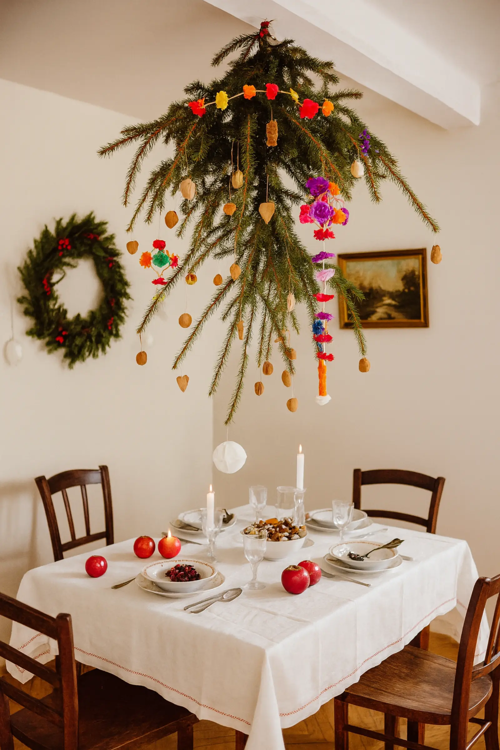Po zamocowaniu konstrukcji przechodzimy do dekorowania. Można postawić na ozdoby tradycyjne jak i bardziej nowoczesne. Papierowe sznury i orzechy pomalowane farbkami będą pięknym tradycyjnym akcentem, natomiast wybierając delikatne lampki LED, lekkie bombki czy szydełkowe ozdoby nasza podłaźniczka stanie się prawdziwą "sufitową choinką".