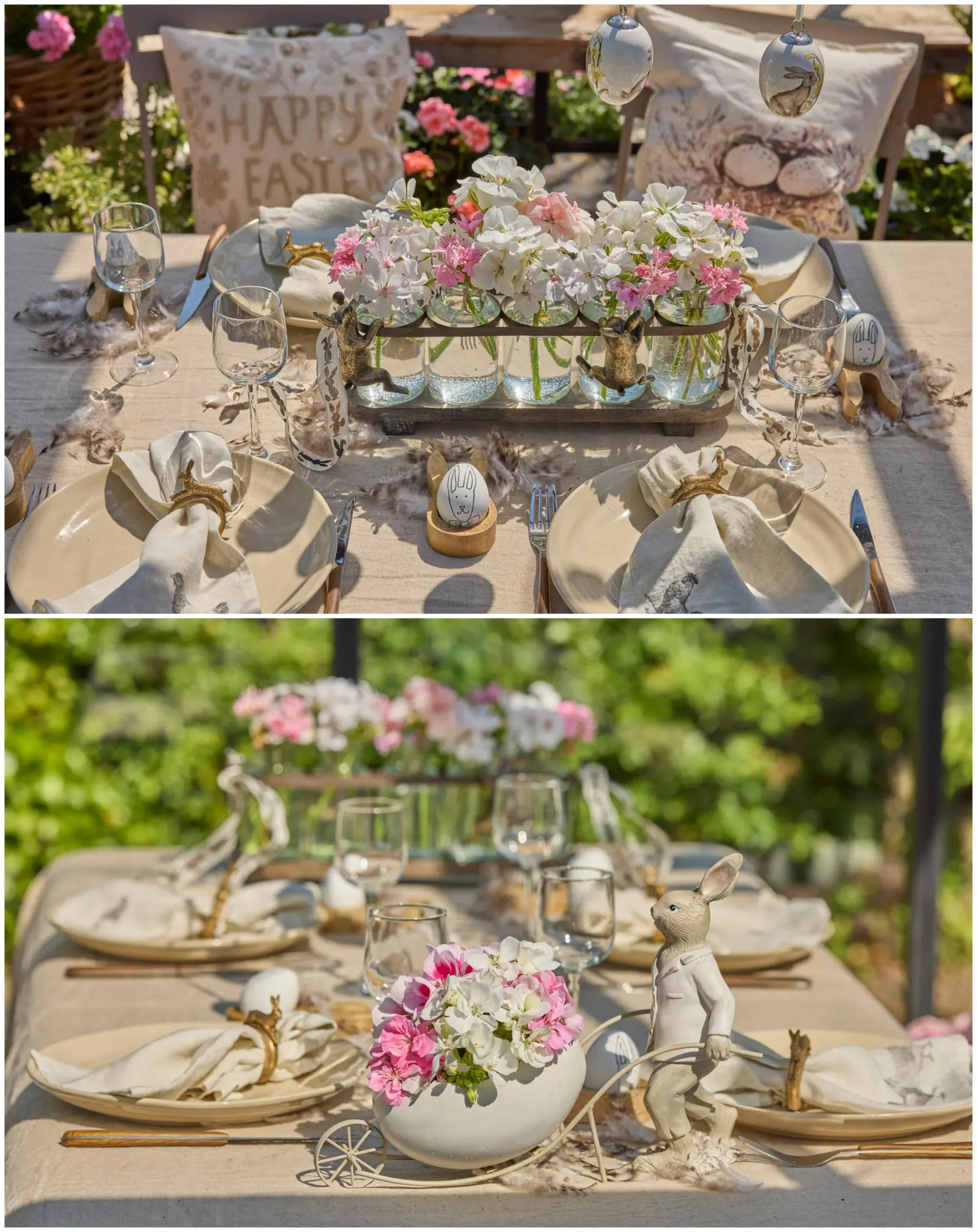 Bujne kwiaty pelargonii w odcieniach moreli, różu i bieli wypełniają pięć szklanych wazonów, ustawionych w metalowym stojaku ozdobionym wielkanocnymi zajączkami. Tworzy to romantyczny punkt centralny na świątecznie nakrytym stole w stylu vintage. Artystycznie udekorowane pisanki, miękkie poduszki z wielkanocnymi motywami, drewniane kieliszki na jajka w kształcie króliczych główek oraz eleganckie obrączki na serwetki z małymi zajączkami dopełniają ten uroczy, świąteczny zestaw.