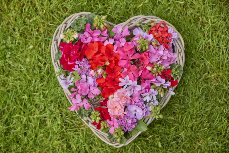 Równie efektowna jest wiklinowa dekoracja w kształcie serca, wypełniona gąbką florystyczną, pełna intensywnie kolorowych, ciętych pelargonii. Ta aranżacja jest symbolem miłości i uczucia, a dzięki swoim barwom i kształtowi przyciąga wzrok i zapewnia długotrwałą radość.