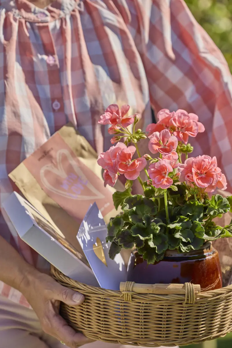 Jeśli wolisz klasyczne rozwiązanie, wybierz kosz prezentowy z różową pelargonią, kartką i drobnymi upominkami, takimi jak herbata czy czekoladki — to prezent, który wyraża ciepłe uczucia, wdzięczność i letni nastrój.