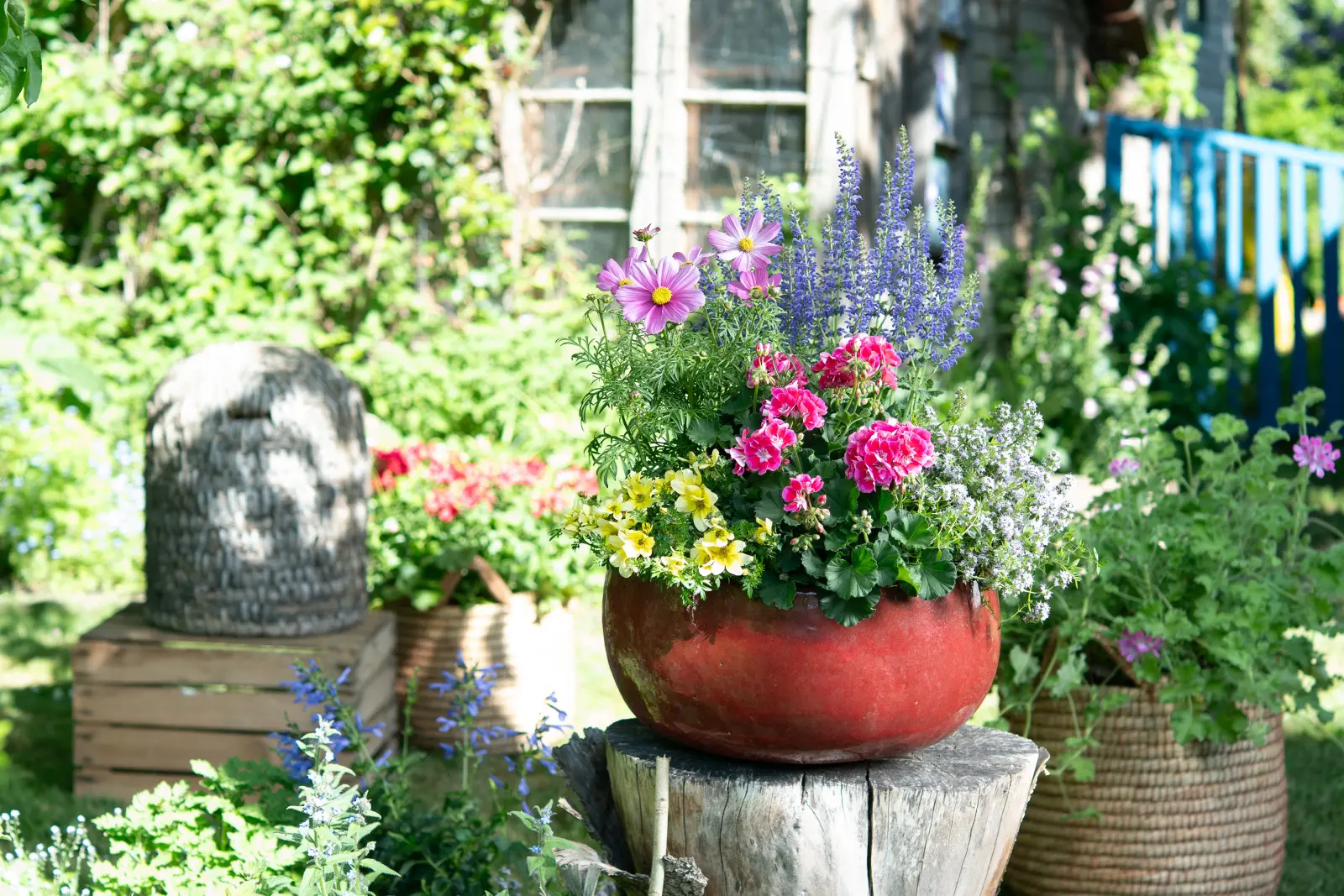 Miniaturowy ogródek w wiklinowym koszu po lewej stronie prezentuje bujne, łatwe w pielęgnacji pelargonie: rabatowe, zwisające i pachnące, w towarzystwie tymianku, pomidorów i bakłażanów. Ta kolorowa kompozycja roślin jadalnych i ozdobnych dostarcza pszczołom i innym owadom mnóstwa pożywienia, tworząc w ogrodzie inspirowanym naturą efektowny, a jednocześnie prosty element dekoracyjny.