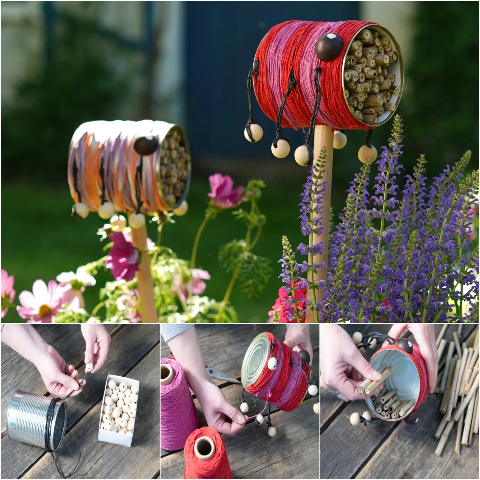 Domowe hotele dla owadów to cenne miejsca schronienia dla małych stworzeń i wesoły akcent w ogrodzie. Ta wersja DIY zamienia zwykłe puszki w kolorowe „stworki”, które wyróżniają się wśród pelargonii i letnich kwiatów przyjaznych pszczołom, takich jak kosmos czy szałwia omszona.