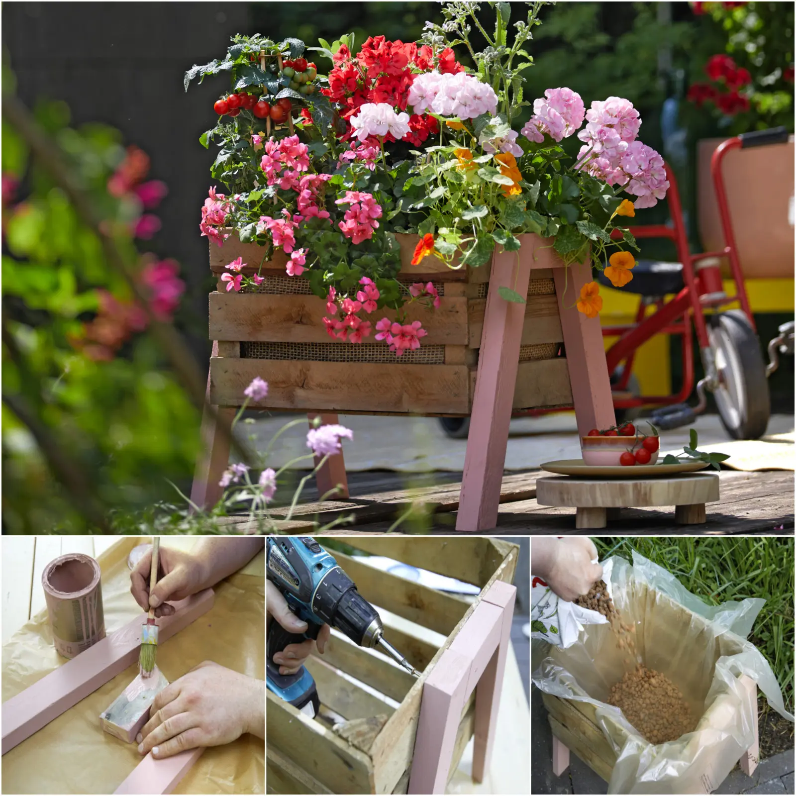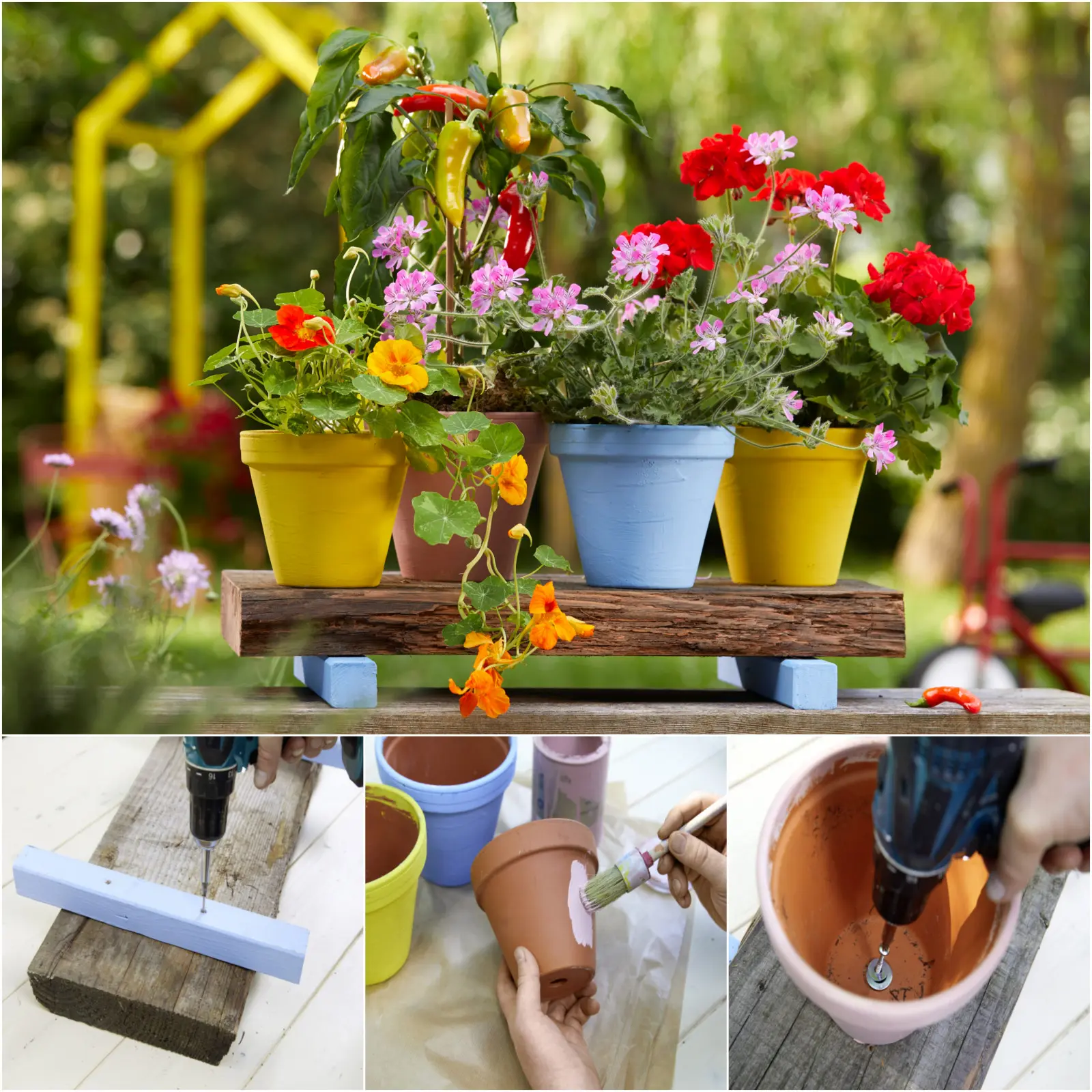 Kolorowy zestaw donic z pelargoniami pachnącymi i rabatowymi, nasturcjami oraz papryczkami ustawiony na drewnianym stojaku nie tylko pięknie wygląda i wspaniale pachnie, ale też dostarcza świeżych składników do kuchni i mnóstwa pożywienia dla owadów. Ten pomysł DIY można zrealizować w zaledwie kilku krokach.