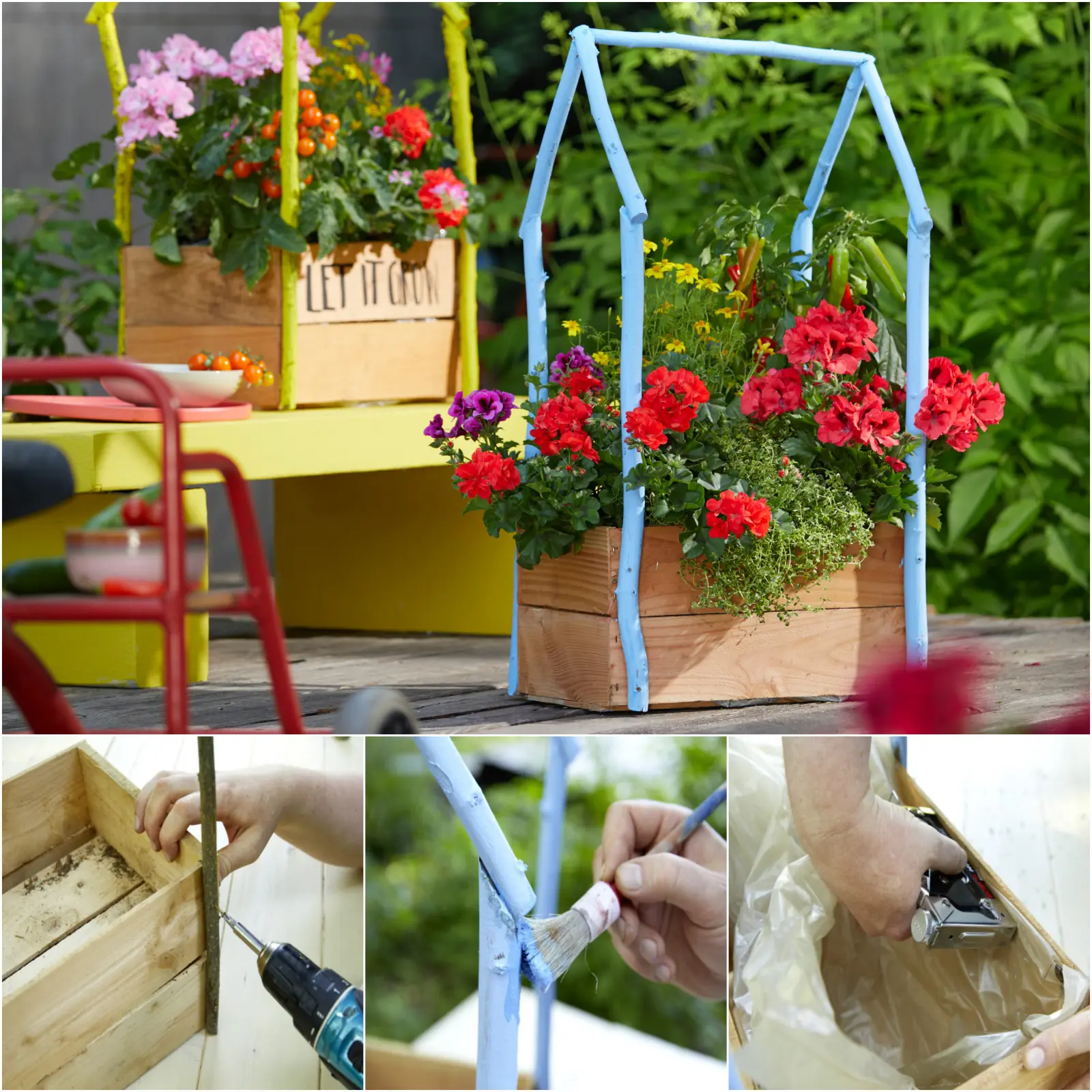 Stwórz dekoracyjne mini szklarnie, wykorzystując rustykalne drewniane skrzynki i kolorowe gałązki, aby w oryginalny sposób wyeksponować pelargonie, uczep rózgowaty, pomidory, papryczki i nasturcje. Ten kreatywny projekt łączy piękne kwiaty, zapachy i smakołyki z ogrodu, a przy tym dostarcza pszczołom i motylom mnóstwa pożywienia.