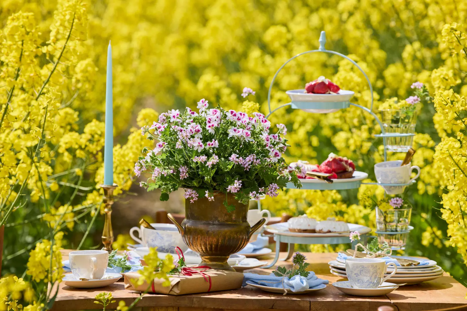 Starannie przygotowany stół ustawiony przed polem kwitnącego rzepaku zachęca do relaksu i wyciszenia. Pelargonie harmonijnie komponują się z tym naturalnym otoczeniem. Niezależnie od tego, czy rosną w ceramicznej lub glinianej donicy, postarzałym metalowym pojemniku, czy rustykalnym wiklinowym koszu, ich wyraziste kolory pięknie kontrastują z jaskrawożółtym falującym rzepakiem. Wszystko wydaje się nieco niedoskonałe i improwizowane – i właśnie to sprawia, że jest tak urzekające.