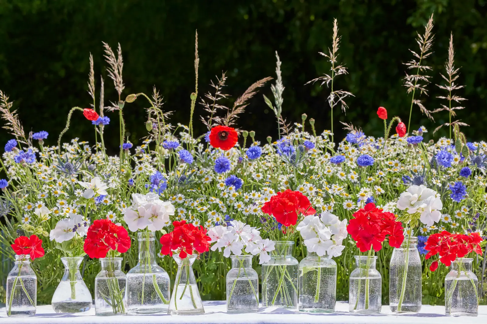 Ta dekoracja stołu, po lewej stronie, prezentuje intensywnie czerwone i białe pelargonie w prostych, szklanych wazonach na tle chabrów, rumianku, maków i traw. Aranżacja wygląda lekko – i właśnie to sprawia, że jest tak urokliwa. Pokazuje, jak dobrze pelargonie komponują się z polnymi kwiatami.