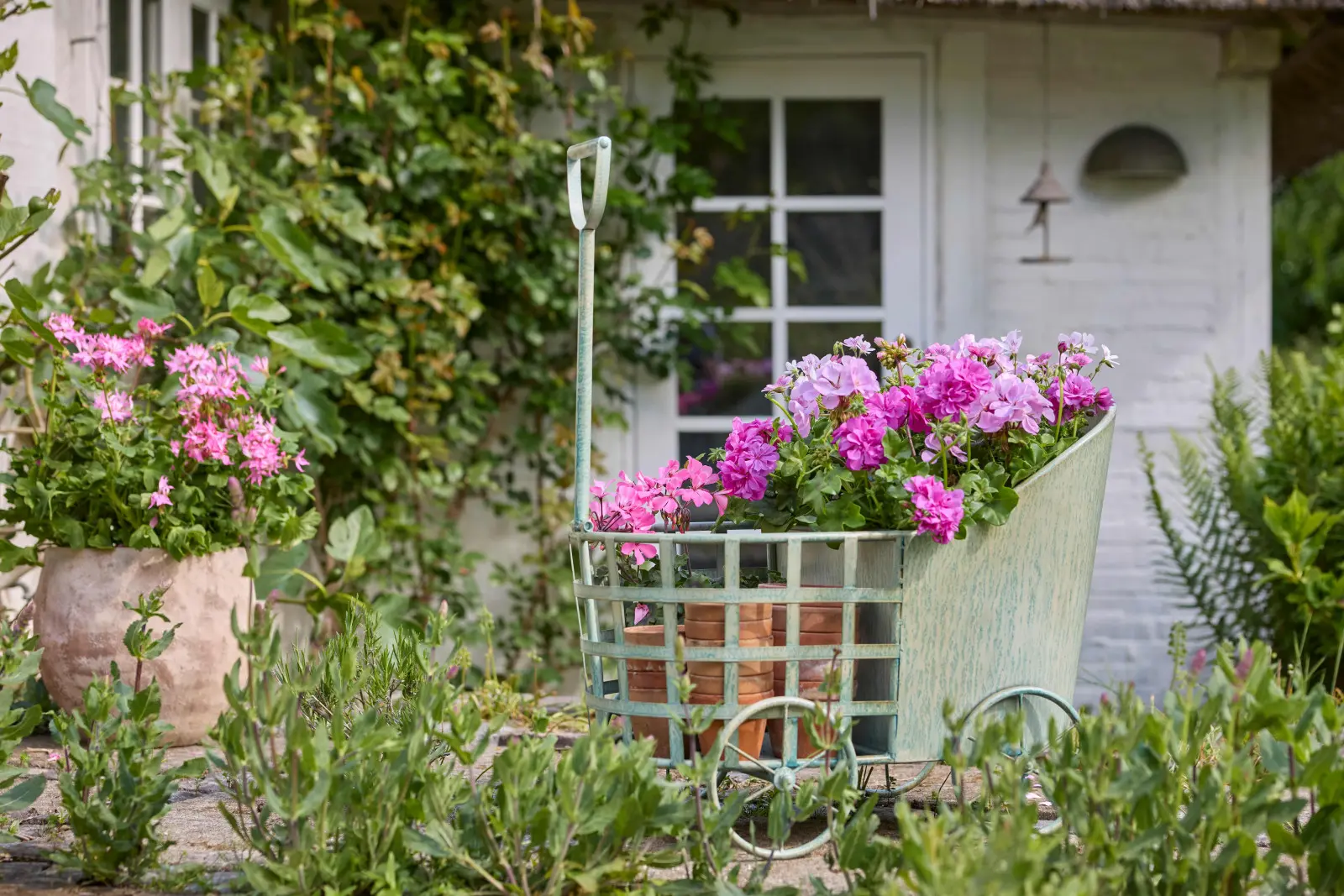 Pelargonie w koszach shabby-chic, cynkowych wiadrach vintage, ceramicznych donicach czy w starej kamiennej misie – w połączeniu z retro pojemnikami wprowadzają do ogrodu urok wiejskiej chaty.