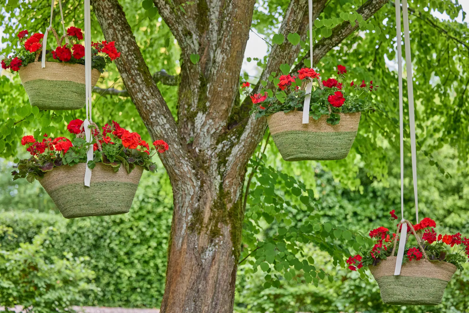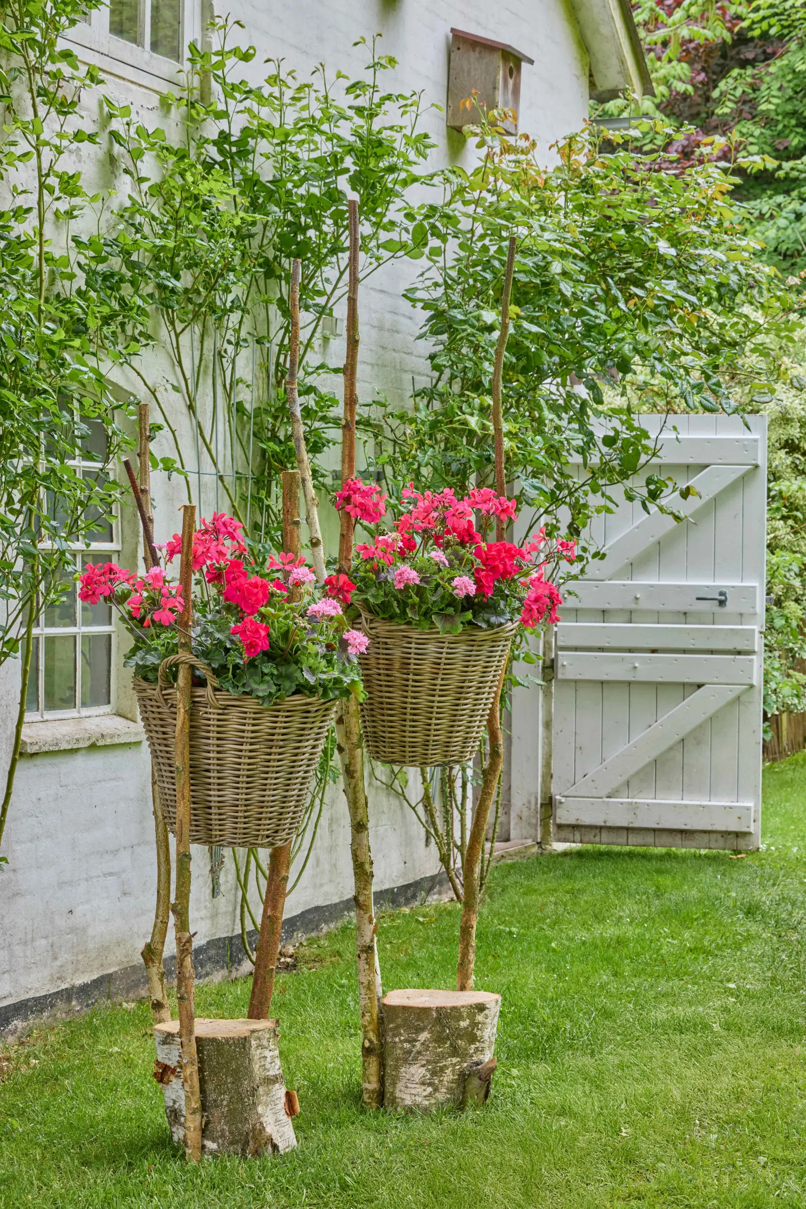 Te ręcznie wykonane, rustykalne stojaki na rośliny, z naturalnego drewna i ozdobnych koszy, tworzą stylową ekspozycję dla pelargonii i wprowadzają do ogrodu charakter. Z odrobiną wprawy każdy może łatwo odtworzyć taki naturalny projekt. Do każdego stojaka przykręcono trzy długie gałęzie do fragmentu pnia drzewa. Dwie z nich przechodzą przez uchwyty kosza, w którym umieszczono bujne, kwitnące pelargonie, tworząc stabilną i elegancką kompozycję.