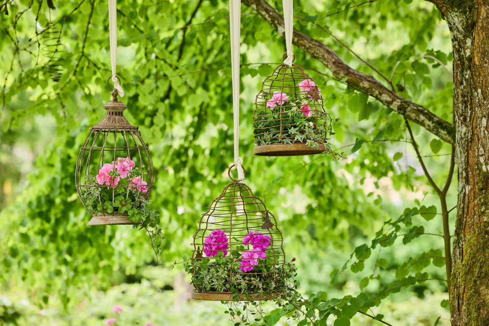 Bujne kwiaty, radosne akcenty i nuta nostalgii – ogrody w stylu wiejskiej chaty pełne są romantycznego uroku i twórczych pomysłów. W starych klatkach dla ptaków w stylu vintage lub w torbach z rafii, zawieszonych na długich wstążkach na gałęziach, kolorowe pelargonie stają się wiszącymi punktami centralnymi. Te unikalne, przerobione aranżacje stanowią ciekawą alternatywę dla tradycyjnych wiszących koszy.