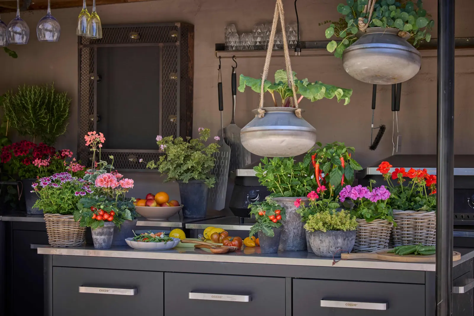 Ta stylowa, zewnętrzna kuchnia na zadaszonej werandzie to przykład nowoczesnego, wiejskiego życia w najlepszym wydaniu: funkcjonalna, blisko natury i pięknie zaprojektowana. Otoczona aromatycznymi ziołami, pomidorami i innymi warzywami, pelargonie – w tym jadalne, pachnące odmiany – wprowadzają kolor i inspirują do kreatywnego gotowania.