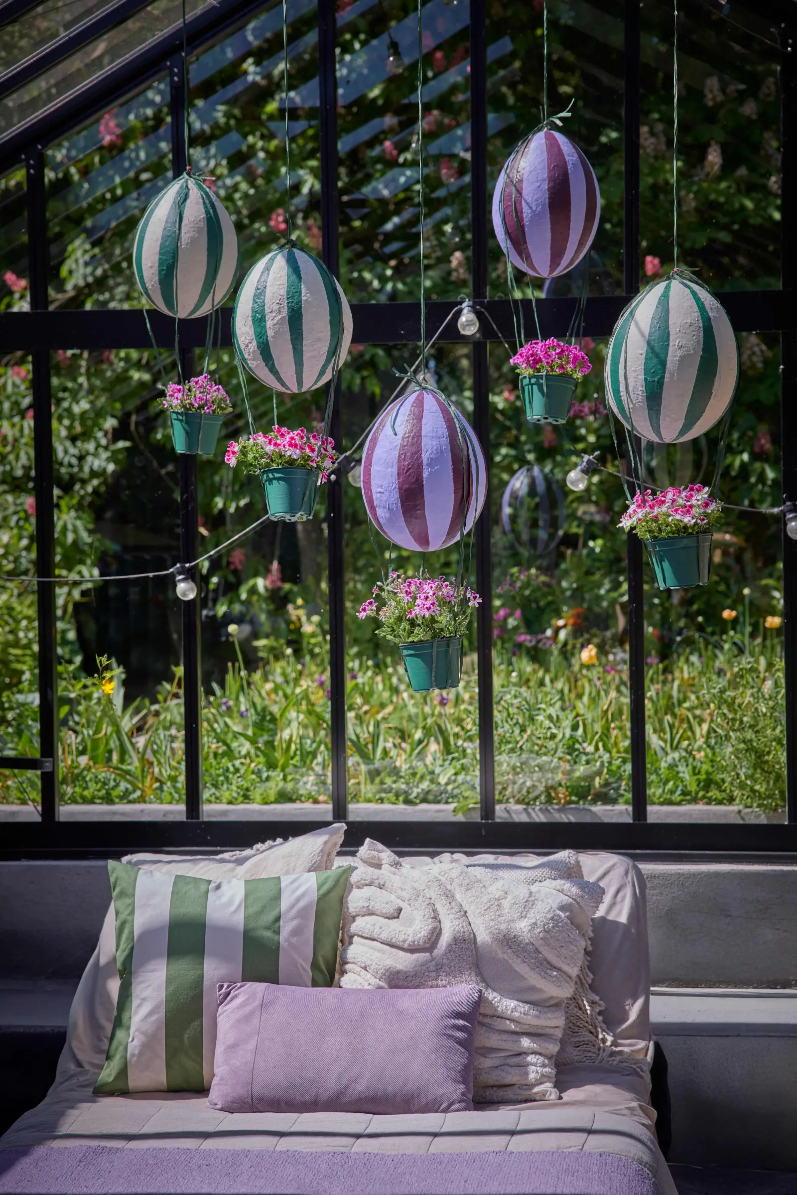 Ten rękodzielniczy pomysł wprowadza uroczy, zabawny akcent do naturalnej, nowoczesnej estetyki. Kosze z pelargoniami zawieszono w oranżerii razem z kolorowymi balonami, tworząc efekt unoszących się balonów na gorące powietrze – jakby kwiaty unosiły się w powietrzu. Balony tworzy się, oklejając nadmuchane powietrzem formy gazetami i klejem do tapet, a po wyschnięciu maluje na żywe, intensywne kolory.