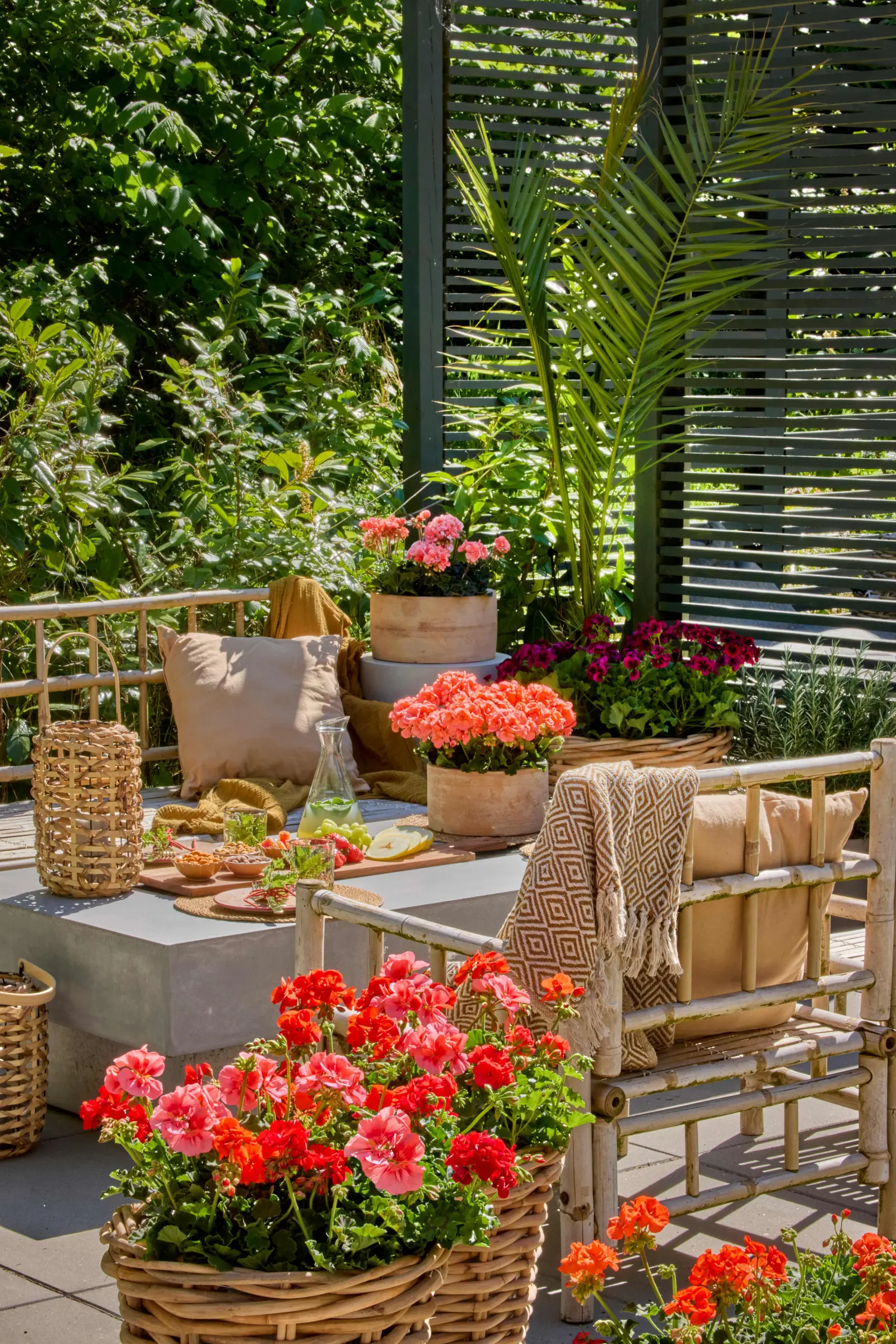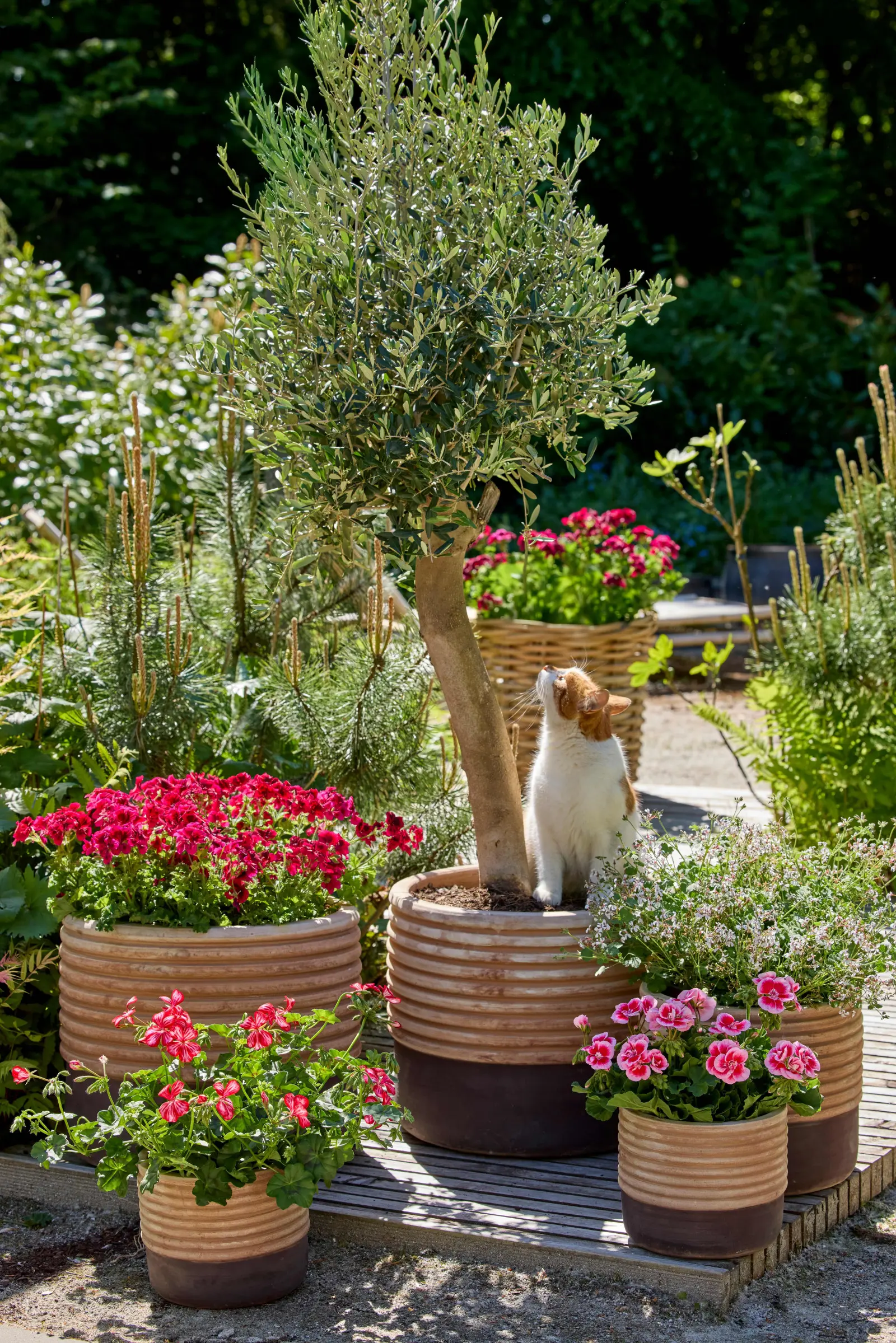 Pelargonie i drzewko oliwne zestawiono w eleganckich, żłobionych, drewnianych donicach, tworząc spójną kompozycję. Delikatne, naturalne tony donic nawiązują do kolorystyki strefy wypoczynkowej, a żywe kwiaty i aromatyczny zapach pelargonii stanowią wyrazisty kontrast dla bujnej zieleni. Drewniany podest subtelnie dzieli przestrzeń, dodając aranżacji harmonii.