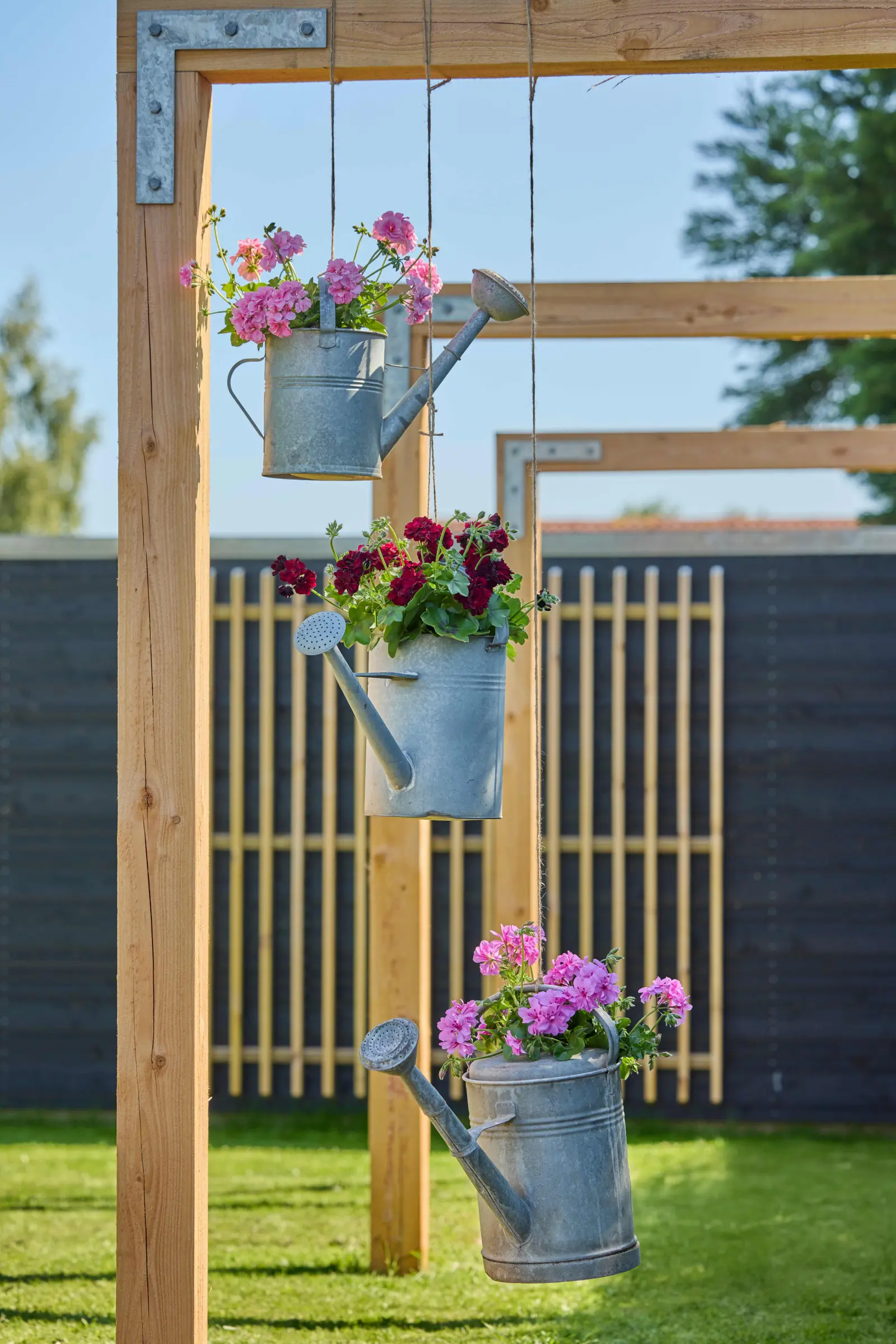 Geometryczna, drewniana konstrukcja z charakterystycznymi metalowymi łącznikami pełni rolę dekoracyjnego elementu architektonicznego – jest jednocześnie minimalistyczna i elegancka. W zestawieniu z wiszącymi, cynkowymi konewkami z pelargoniami powstaje ciekawa, pełna życia kompozycja, łącząca prostotę konstrukcji z wesołym detalem. To kreatywny pomysł na nowoczesne ogrody z charakterem.
