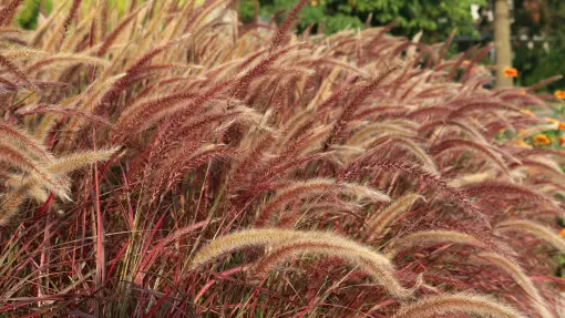 - Rozplenica szczecinowata (Pennisetum setaceum) 'Rubrum' – to wieloletnia trawa ozdobna osiągająca 90 cm wysokości. Ma szerokie, czekoladowobrązowe liście i pod koniec lata tworzy puchate, miękkie w dotyku kwiatostany. Najlepiej rośnie w umiarkowanie wilgotnym, żyznym, przepuszczalnym podłożu i na osłoniętym, ciepłym stanowisku. Na zimę pojemnik z rośliną trzeba przenieść do chłodnego pomieszczenia.