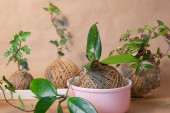 Dobór gatunku do kokedamy uzależniony jest od miejsca, w jakim ozdoba będzie wyeksponowana. W półcieniu sprawdzą się karłowe odmiany roślin ozdobnych z liści, np. bluszczu (na zdjęciach poniżej) czy paproci, fitonie lub zielistki, albo kwitnące fiołki afrykańskie. W jasnym miejscu można uprawiać kokedamę z karłowymi sukulentami lub storczykami.