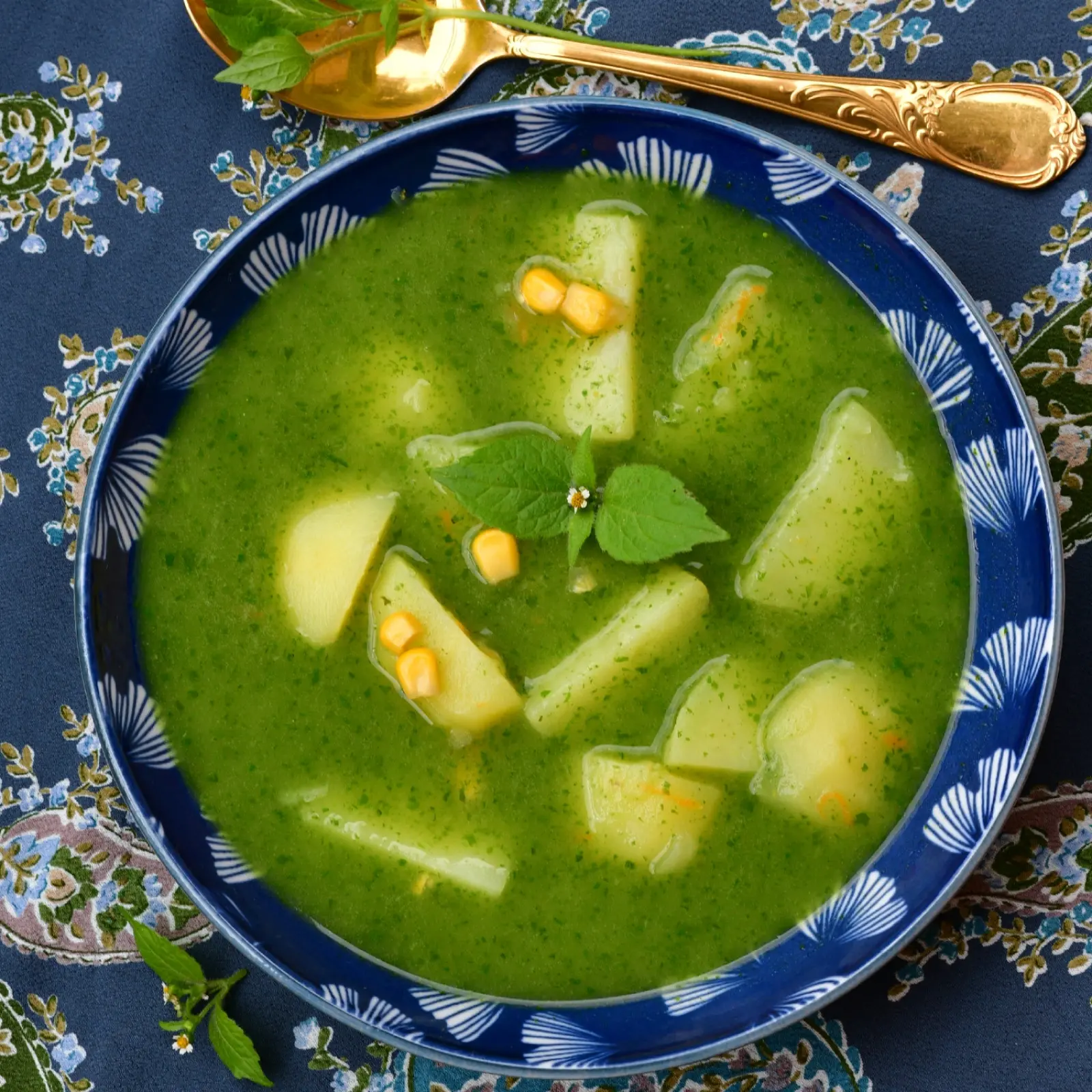 SKŁADNIKI: 1-2 ziemniaki, 1 nieduża cebula, 1 pietruszka, kawałek marchewki, kawałek selera, 2 ząbki czosnku, ok. 1,2 l bulionu, ok. 1-1,5 litra świeżych liści żółtlicy lub 1/3-1/2 szklanki suszonych, zmielonych liści żółtlicy, do smaku: sól, chili, majeranek, tymianek, dodatki do podania: ryż, makaron, ćwiartki ziemniaków, kukurydza, kwaśna śmietana