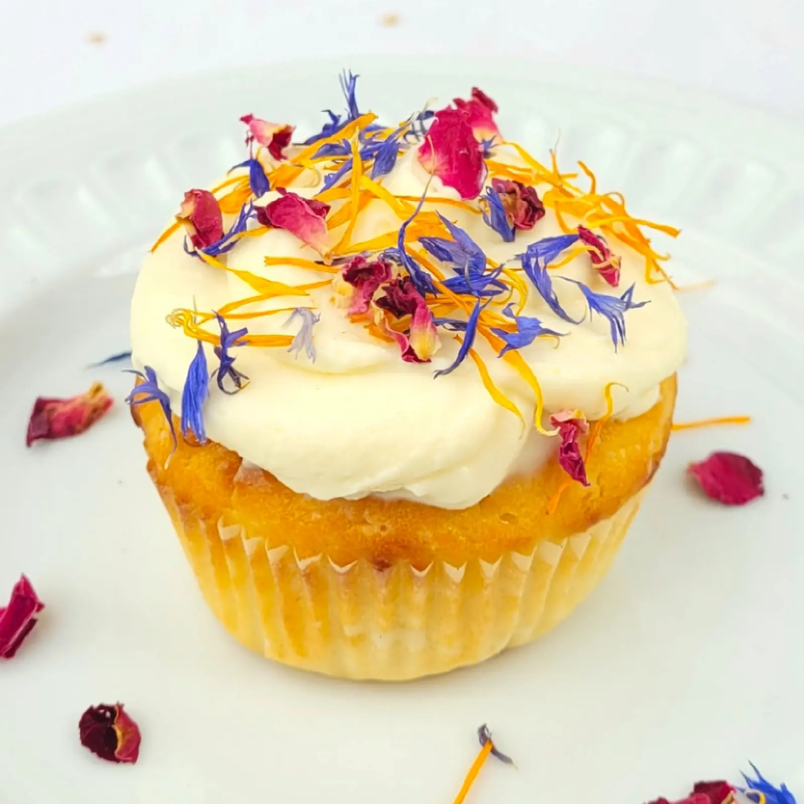 PRZEPIS: W misce wymieszaj wszystkie suche składniki ciasta, następnie wlej mokre składniki. Zamieszaj łyżką tylko do połączenia składników, nie miksuj! Od razu nałóż masę do foremek na babeczki wyłożonych papilotkami i piecz w 180ºC przez ok. 20 minut (do suchego patyczka, ale nie dłużej, żeby nie przesuszyć babeczek). Wymieszaj serek z cukrem i cytryną i nałóż krem na wystudzone babeczki. Babeczki posyp kolorowymi płatkami kwiatów niczym kwiatowym konfetti.