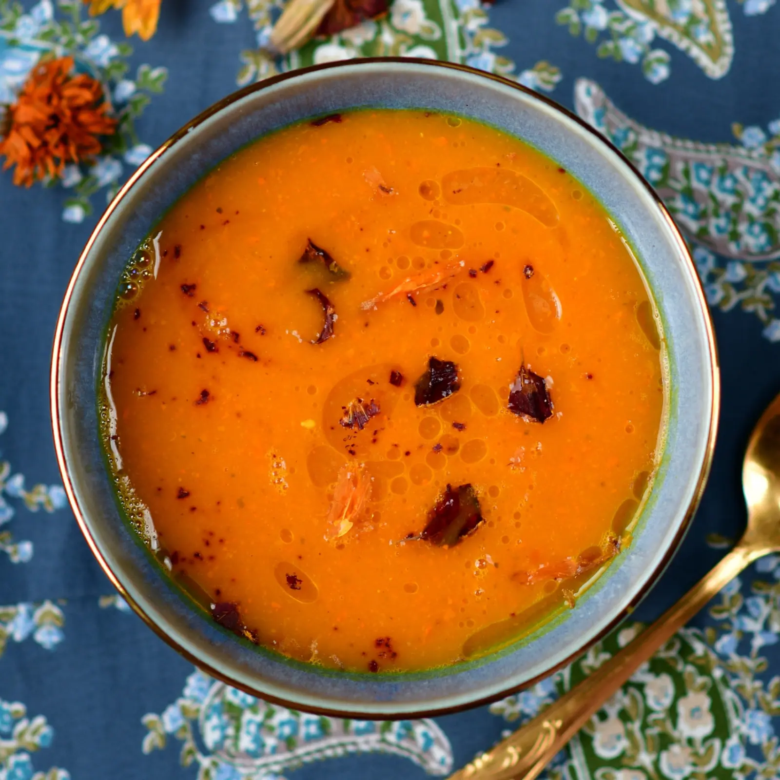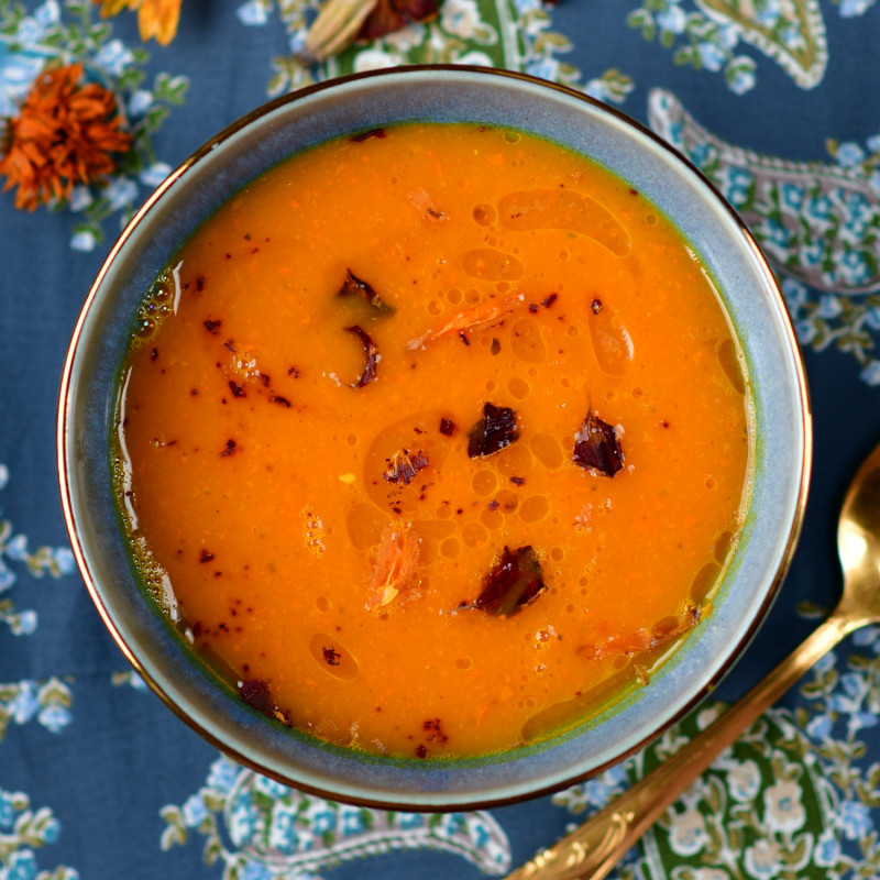 SKŁADNIKI: ok. 1 kg ulubionej dyni (np. Hokkaido, prowansalska, lunga), 1 pietruszka, 1 cebula, 2-3 ząbki czosnku, kawałek pora, kawałek świeżego imbiru, kawałek świeżego kłącza kurkumy lub 2 łyżeczki suszonej kurkumy w proszku, kawałek ostrej papryczki, 1 łyżka oliwy, ok. 1 l bulionu, 1 łyżeczka suszonych płatków aksamitki, tymianek, rozmaryn, oregano, do podania: oliwa, olej dyniowy, podprażone pestki dyni, kwaśna śmietana, grzanki albo ryż