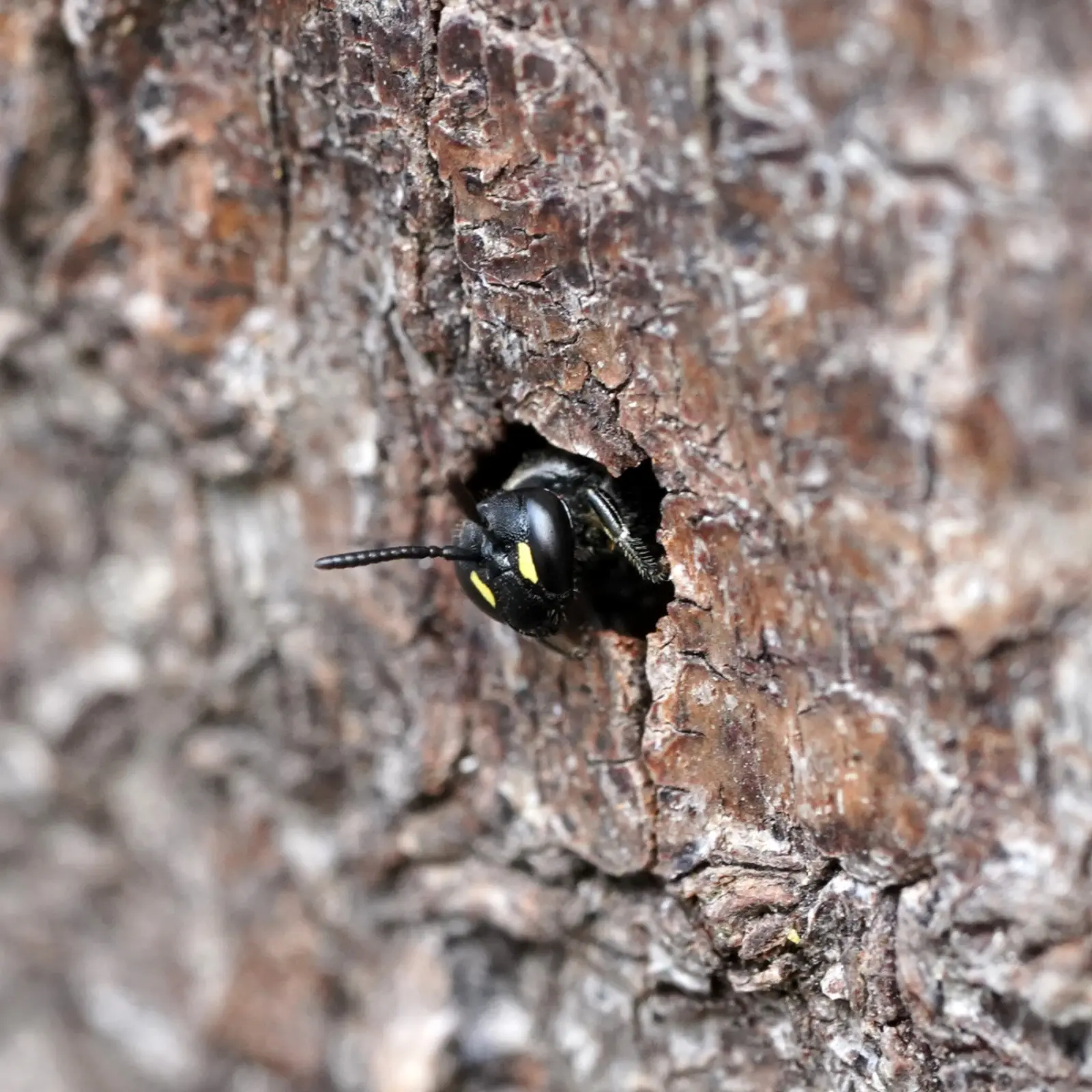Kolejny pszczeli mieszkaniec nie skorzystał z nawierconego przeze mnie tunelu. Jednak wykorzystał taki, który w tym drewnie wydrążył chrząszcz. Średnica tego otworu wynosiła około 2-3 mm, więc pszczoła musiała być malutka. Była to samotka, czyli jedna z drobnych pszczół samotnic. Przyszedł czas, gdy zaopatrywała gniazdo, a potem nastąpił arcyciekawy moment zamykania go. W przeciwieństwie do wspomnianych bolicy i murarki samotki nie tworzą zatyczek z mieszaniny gliny i piasku. Wynikiem ich pracy jest zatyczka, która przypomina okienko, a powstaje ono ze specjalnej wydzieliny.