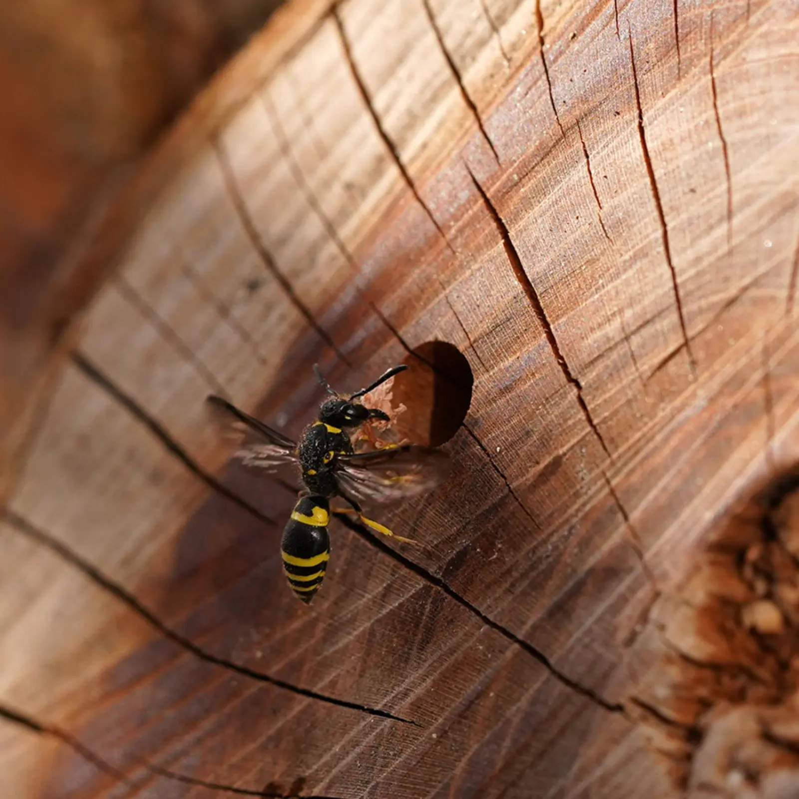 Miałam przygotowany kawałek drewna z drzewa wiśniowego, który wkrótce miał trafić do ogródka znajomych. Jednak moje plany postanowiła pokrzyżować bolica – rodzaj samotnej osy. Osa brzmi groźnie, ale podobnie, jak samotne pszczoły, są to owady płochliwe i łagodne. Owad ten zaczął znosić do wywierconego tunelu pokarm, a wkrótce zaczął zamurowywać otwór wlotowy. Nie pozostało mi nic innego, jak pozostawić pieniek w spokoju i obserwować, jak sytuacja się będzie rozwijać.
