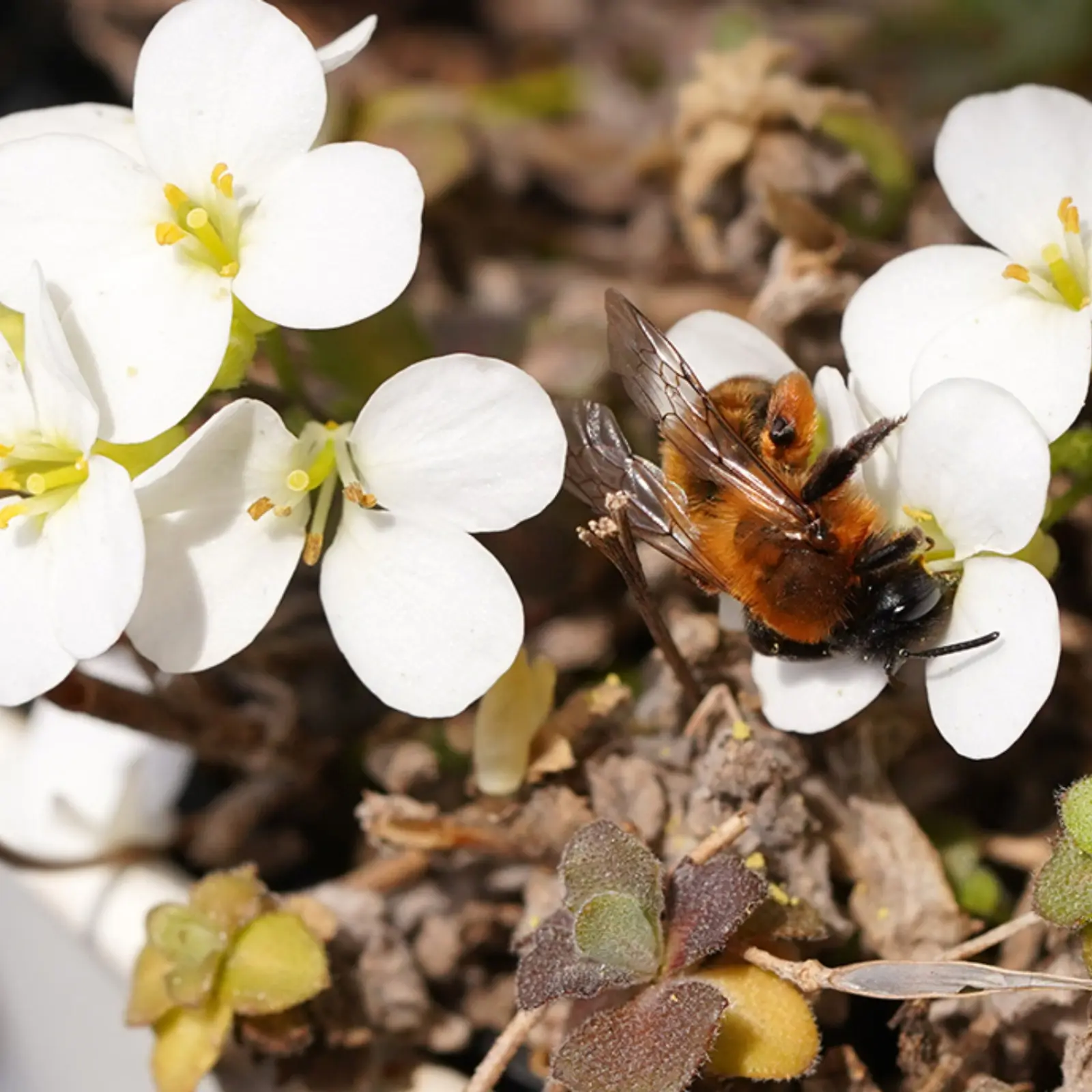 Początek pszczelego sezonu, czyli marzec, rozpoczęłam bardzo klasycznie. Bratki pojawiły się szybko, aby już rozpalać wyobraźnię i oczekiwanie na kolejny czas obserwacji i cieszenia się przyrodą. Bratki budzą głównie zainteresowanie wśród trzmieli. W tym czasie również zakwitł krzew jagody kamczackiej – na balkonie roślina niekoniecznie oczywista. Jak co roku już wczesną wiosną obserwowałam na krzewie buszujące trzmiele. Do bratków dołączyły w kwietniu gęsiówka i skalnica – obie chętnie podejmowały pierwszych pszczelich oblatywaczy. Najczęściej odwiedzały je piękne pszczoły z rodzaju pszczolinka, ale i moje ukochane trzmiele też chętnie się zjawiały.