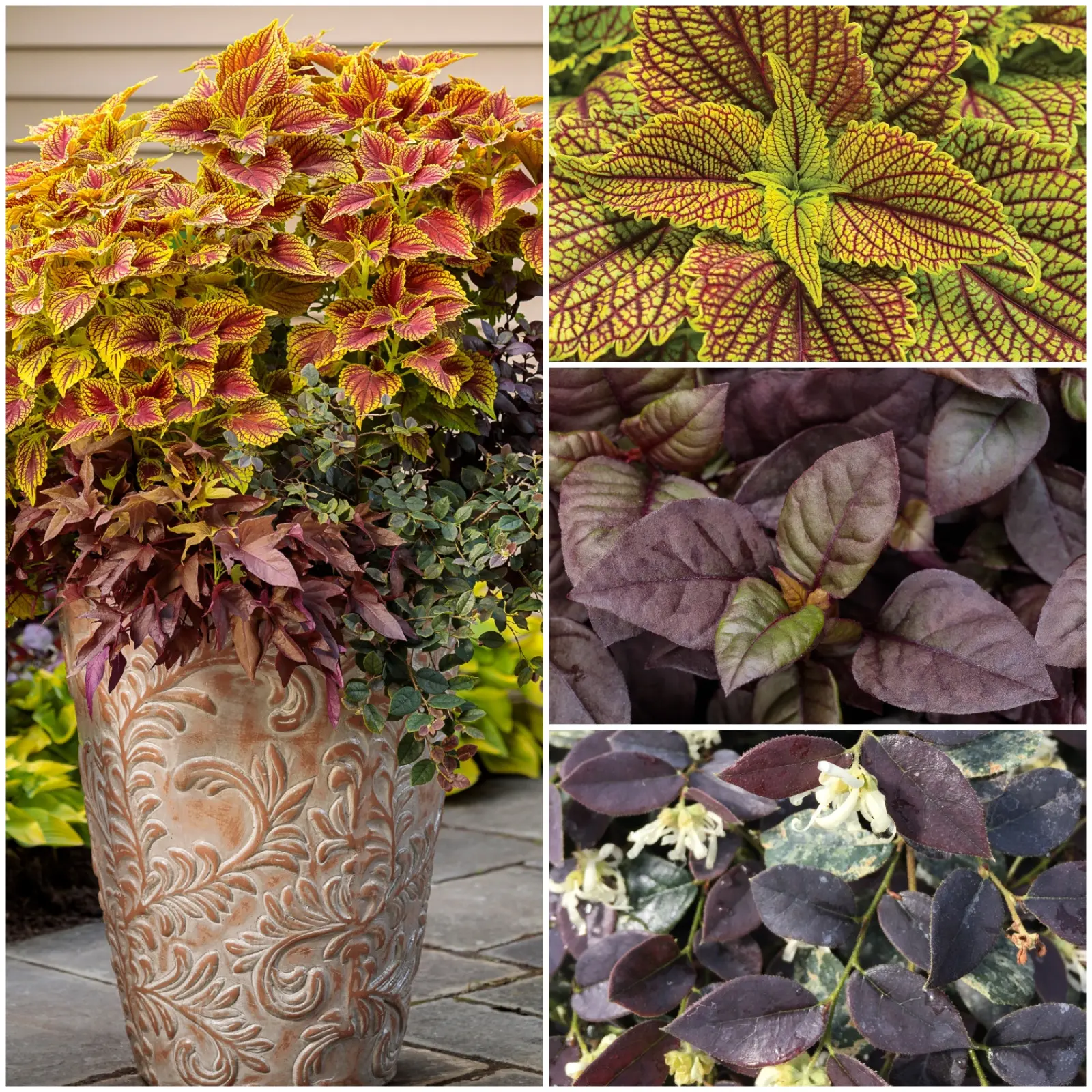 Koleusy uprawia się w donicach na balkonach z uwagi na liście, a nie kwiaty. Odmian jest mnóstwo, mają niezwykłe kombinacje kolorystyczne. Rośliny te najlepiej rosną w półcieniu lub w miejscach z rozproszonym światłem. Wymagają regularnego podlewania i żyznego podłoża, aby zachować intensywne barwy. To świetny wybór dla osób, które chcą stworzyć niebanalną aranżację bez klasycznych kwiatów. W tej ceramicznej donicy posadzono koleus (Coleus scutellarioides) Golden Dreams™oraz dwie inne rośliny ozdobne z liści – Alternanthera Plum Dandy™ i loropetalum chińskie (Loropetalum chinense) Jazz Hands Night Moves®.