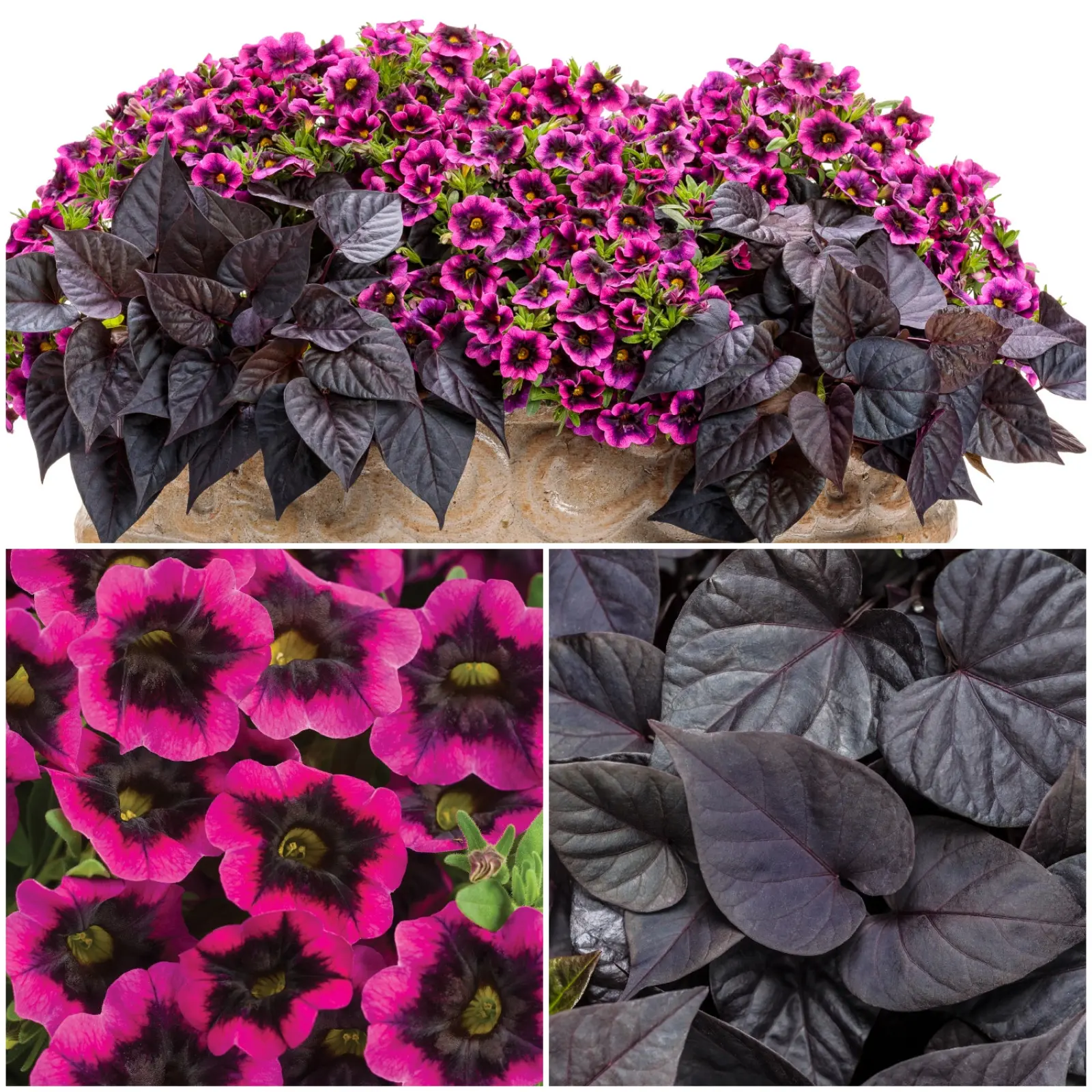 Calibrachoa, często nazywana „milion bells”, to kwitnąca roślinna balkonowa, która zachwyca ogromną liczbą drobnych kwiatów. Preferuje stanowiska słoneczne lub lekko zacienione oraz przepuszczalne podłoże. Wymaga regularnego nawożenia, aby utrzymać intensywne kwitnienie przez cały sezon. To idealna propozycja do wiszących koszy lub większych skrzynek, czyli pojemników, z których pędy z kwiatami mogą swobodnie opadać. W tej donicy rośnie ciemnoróżowa CalibrachoaSuperbells® Blackcurrant Punch™ zestawiona z wilcem ziemniaczanym (Ipomea batatas) Sweetheart Jet Black™.