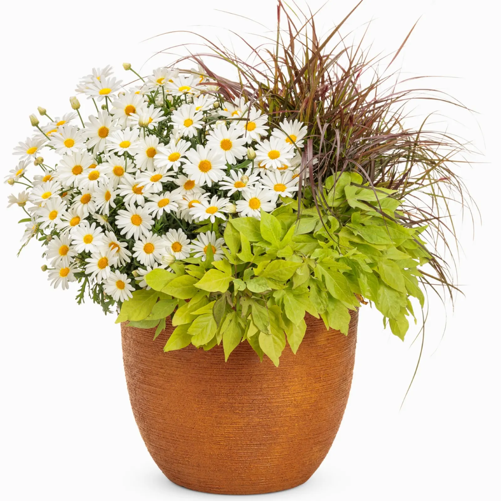 Margerytki to lekkie i radosne kwiaty, które wprowadzają na balkon naturalny, ogrodowy klimat. Najlepiej czują się na stanowiskach słonecznych, gdzie mają dostęp do dużej ilości światła. Wymagają regularnego podlewania oraz usuwania przekwitłych kwiatów; nie warto zaniedbywać tych zabiegów, gdyż to pobudza je do dalszego kwitnienia. Doskonale prezentują się zarówno w pojedynczych donicach, jak i w mieszanych kompozycjach. Tu obok margertyki (Argyranthemum frutescens) Pure White Butterfly® posadzono wilec ziemniaczany (Ipomoea batatas) Sweet Caroline Medusa™ Green oraz rozplenicę szczecinkowatą (Pennisetum setaceum) 'Rubrum'