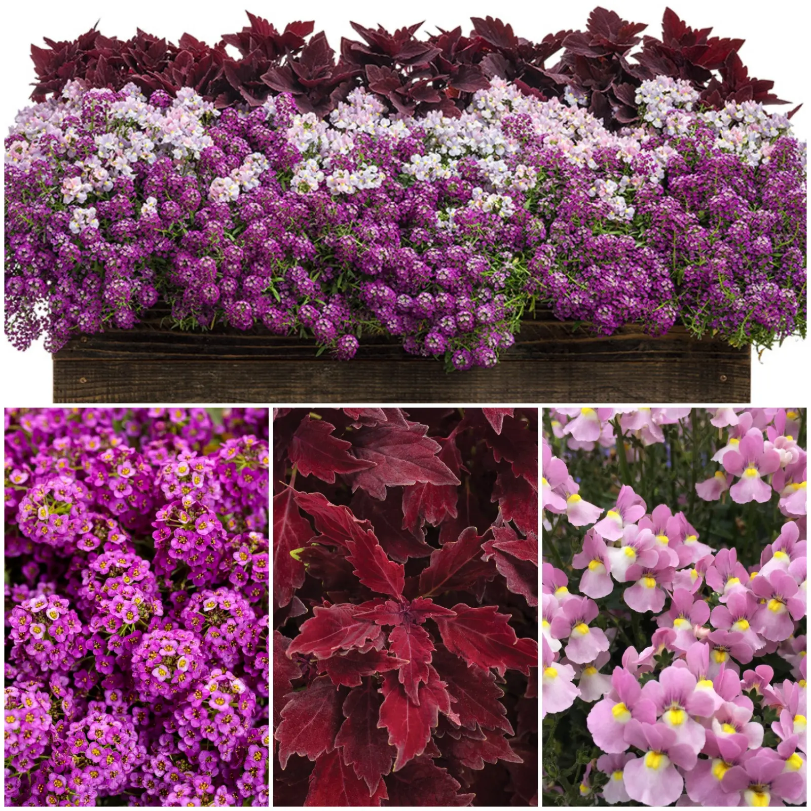 Smagliczka nadmorska (Lobularia maritima) to niska, rozrastająca się roślina, która tworzy gęste kobierce drobnych, pachnących kwiatów (od wiosny do lata). Odmiana 'Violet' zachwyca intensywnym kolorem i delikatnym zapachem. Najlepiej rośnie w pełnym słońcu lub lekkim półcieniu. Jest mało wymagająca i dobrze znosi krótkotrwałą suszę, co czyni ją świetnym wyborem dla początkujących. W tej drewnianej skrzynce posadzono smagliczkę Violet Knight®, różową nemezją (Nemesia fruticans) Aromance® Pink i purpurowe koleusy (Coleus scutellarioides) Royale Cherry Brandy®.