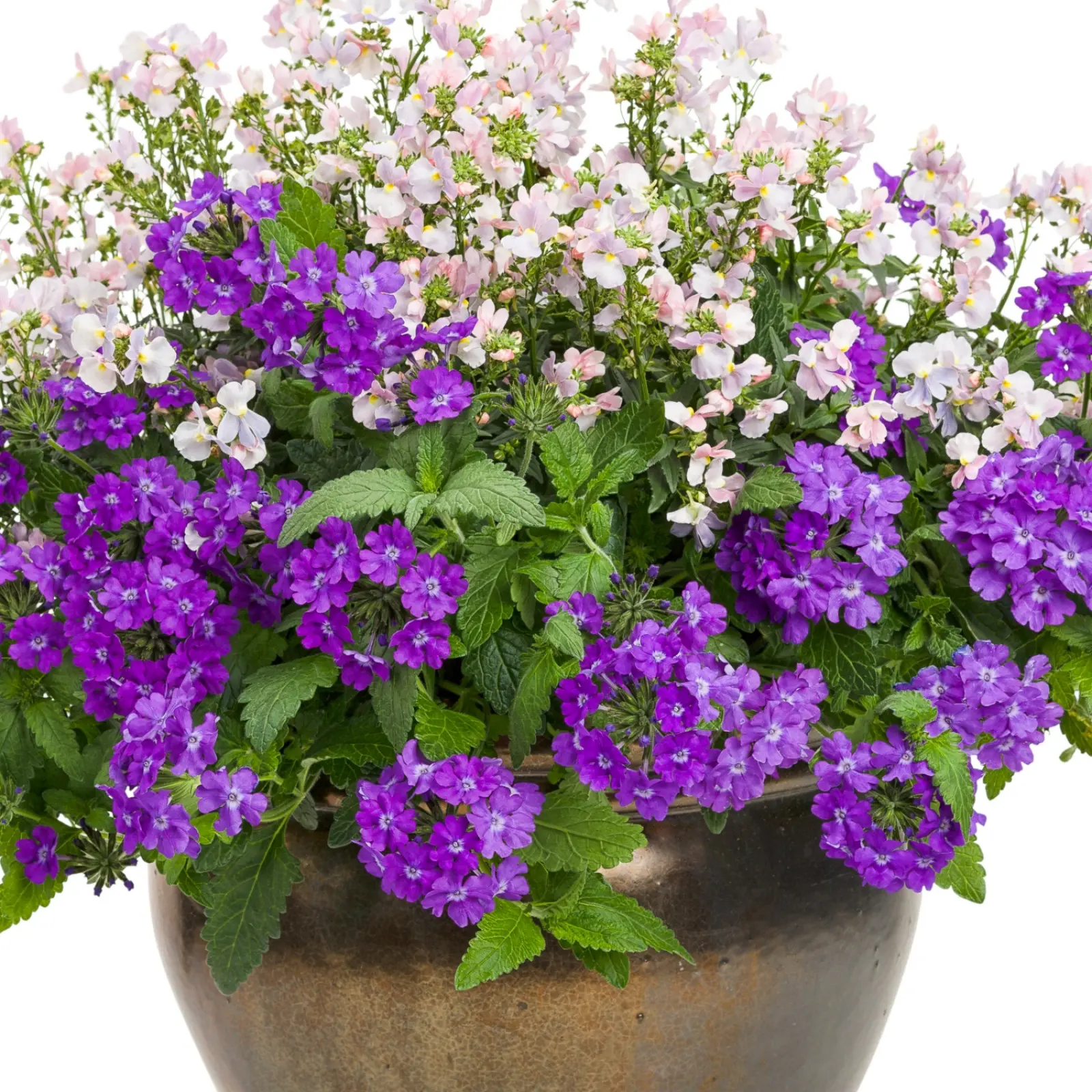 Werbena ogrodowa (Verbena x hybrida) to roślina, która łączy w sobie piękny wygląd i dużą odporność na trudne warunki. Najlepiej rośnie w pełnym słońcu, gdzie kwitnie najobficiej. Dobrze znosi okresowe przesuszenie, choć dla najlepszego efektu warto podlewać ją regularnie. Jej delikatne kwiatostany dodają balkonowi lekkości i elegancji. Pędy werbeny przewieszają się, więc tę roślinę najlepiej posadzić w wiszącym koszu lub na brzegu większej donicy. Tutaj zestawioną ciemnofioletową werbenę (Verbena) Violet Ice z blado różową nemezją (Nemesia fruticans) Aromance® Pink